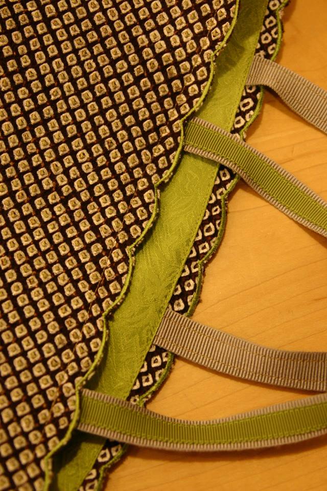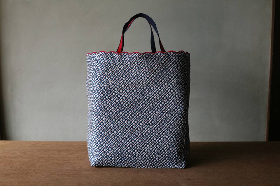 こちらは絞り染めトートバッグ。絞り染め生地、下地ともにシルク100%の贅沢なバッグです。