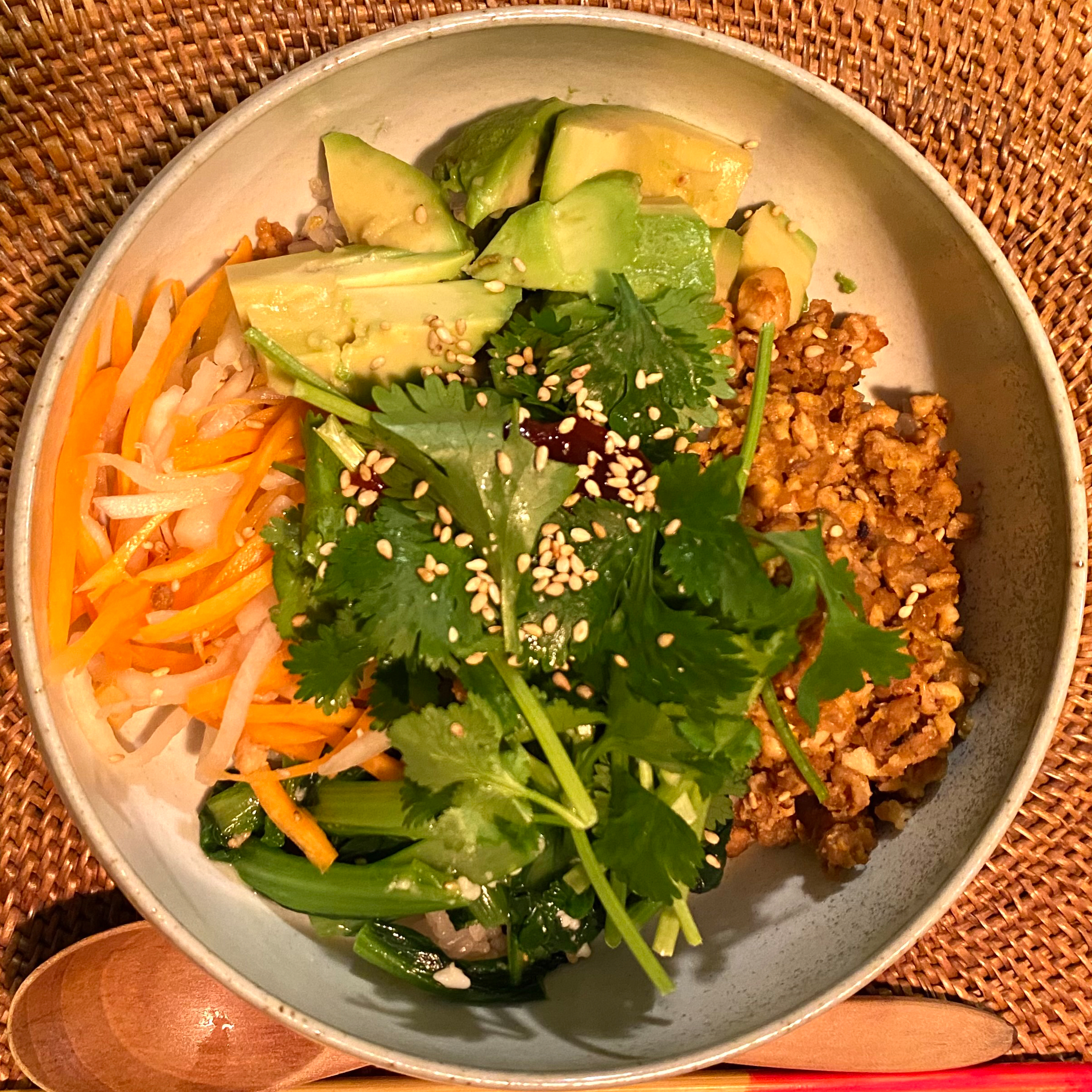 5. 器に炊きたてのご飯をよそい、小松菜、肉代わりの大豆ミートと豆腐を炒めたもの、アボカド、水分をよく切ったなますを盛り付ける。