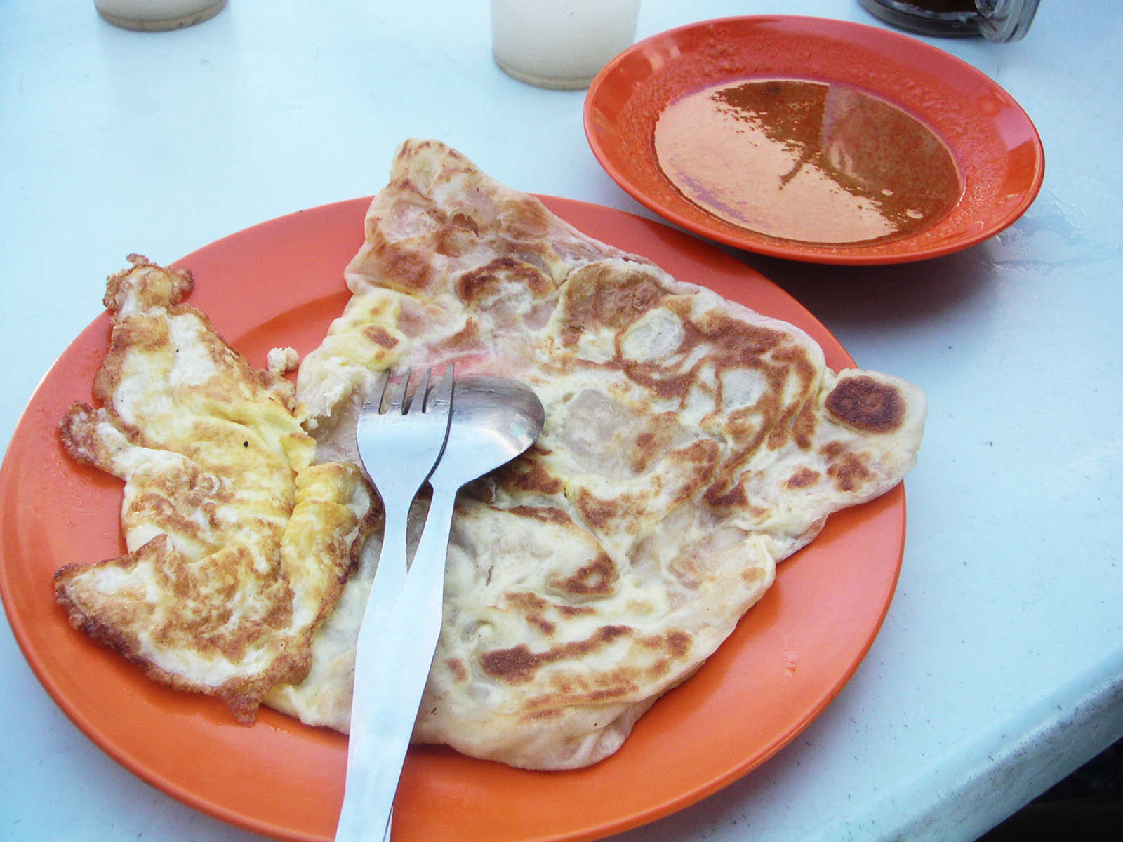 インドで生まれ、マレーシア方面に広まったロティ・プラタは、一日のうちいつ食べても美味しい料理です。こねた小麦粉を宙に投げ上げて薄く伸ばし、油やギーというインドのバターオイルで味付けして出来上がったパンケーキ状の生地を、魚やマトンのカレーにつけて食べる料理で、ロティは「パン」、プラタは「平たい」を意味します。