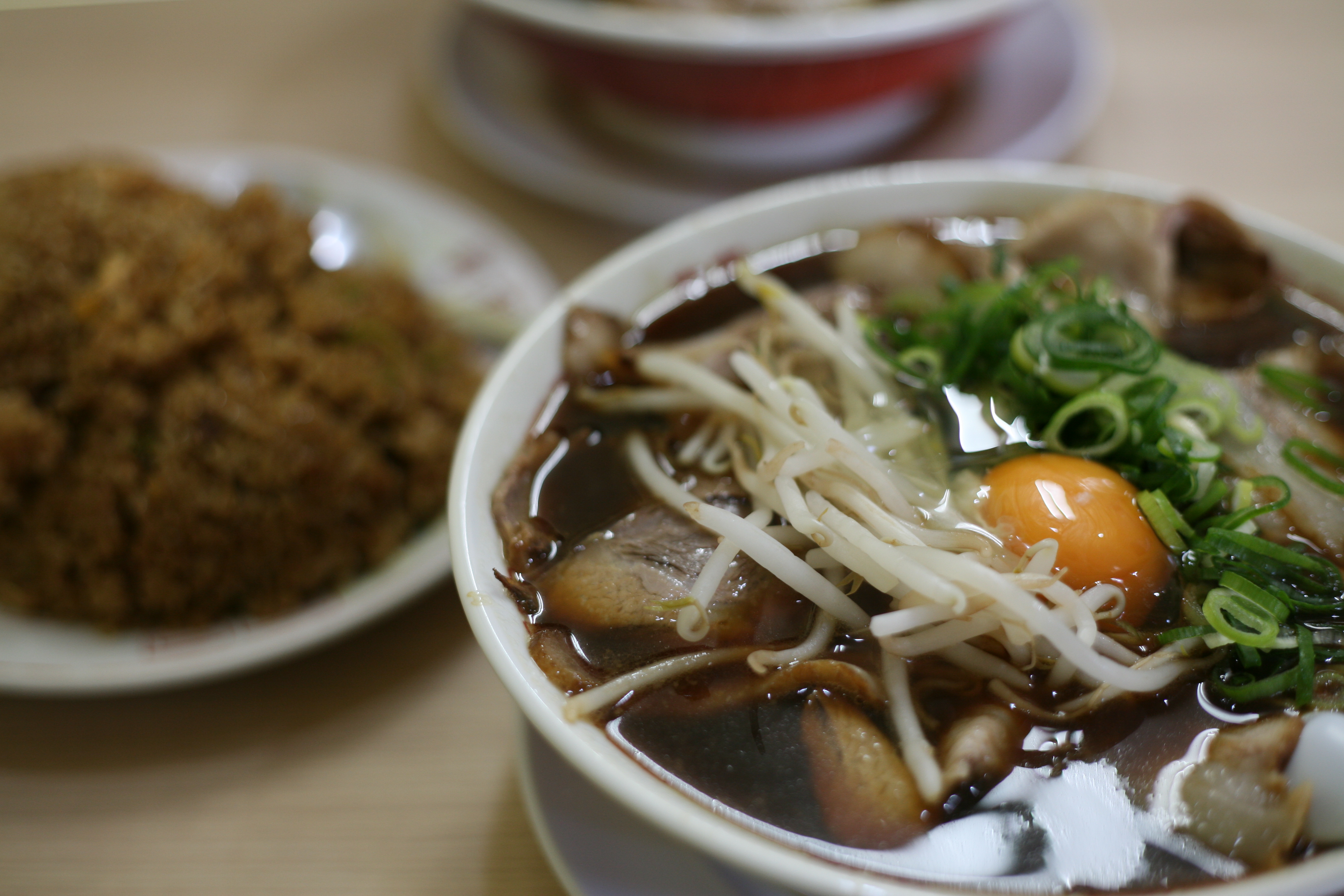 新福菜館といえば、濃い色の醤油スープにストレートの中太麺の中華そばと、同じく濃い色をしたやきめし。中華そばには、もやし、チャーシュー、九条ねぎがバランスよくトッピングされ、どこか昔懐かしい中華そばの姿に重なります。