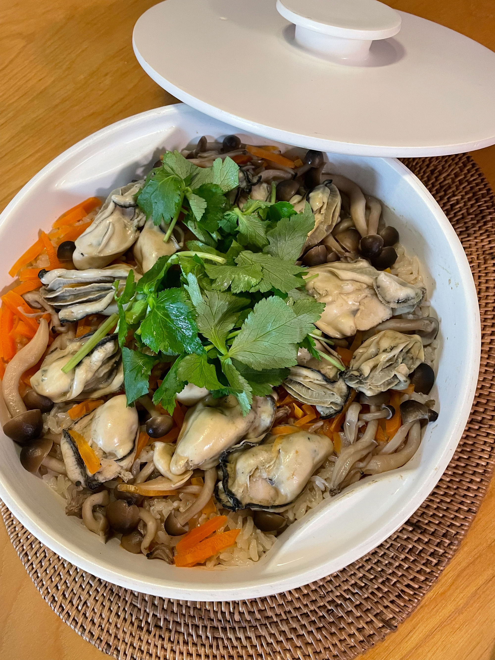 セラミック・ジャパンのdo-nabeでご飯炊きも試したかったので、ふっくら牡蠣ごはんを作ってみることに。牡蠣の栄養素は水溶性で、水に溶け出してしまうとのことなので、ここはしっかり閉じ込めなくては!炊き上がったら、そのまま食卓へドーンです。充分に蒸らしたお米も美味しく、牡蠣の香りも風味も味わえました。