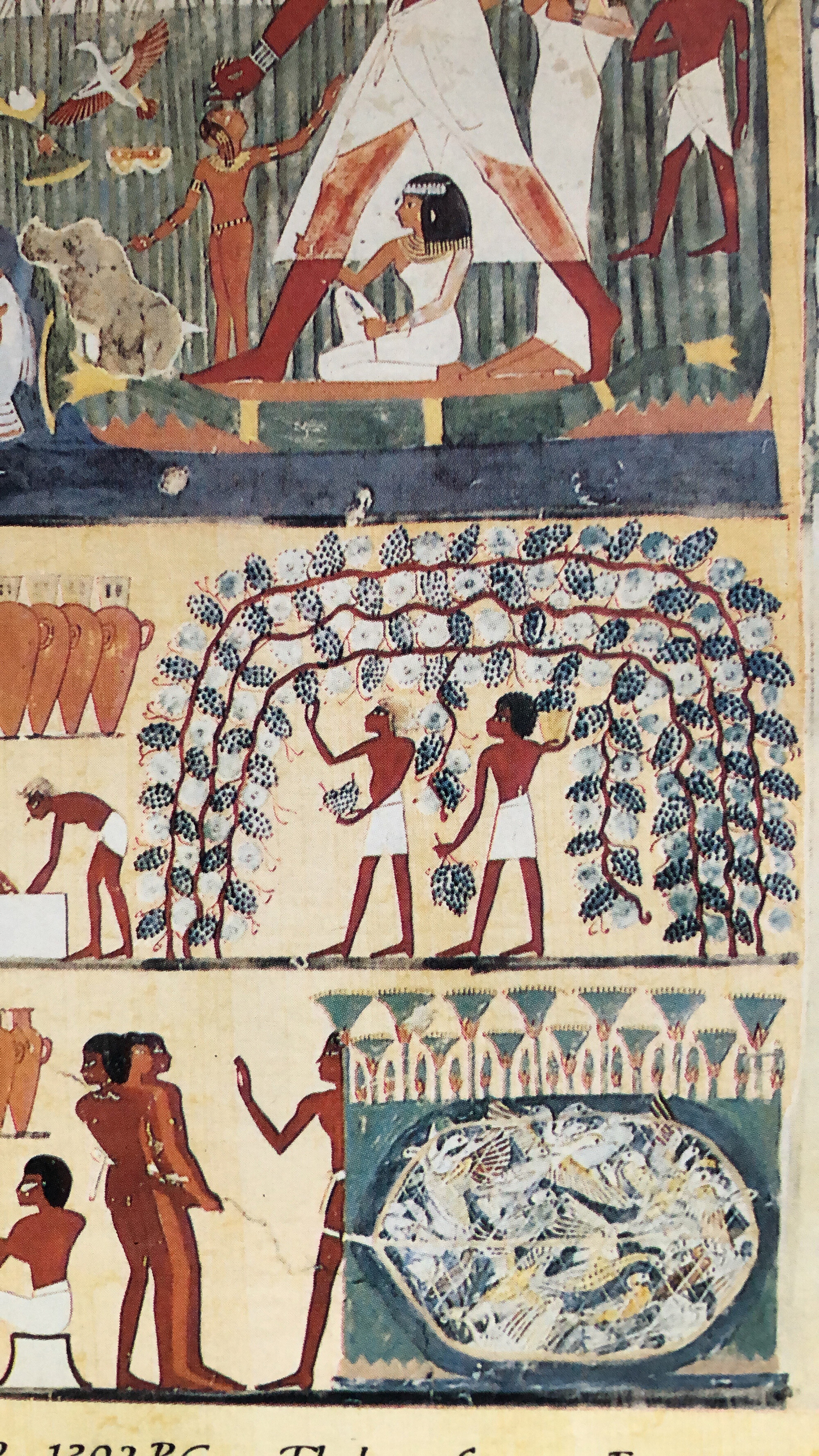 ルクソールにあるトトメス4世の書記で天文官であるナクトの墓には、ワインの醸造工程を記した美しい壁画が残されています。アーチ状に棚仕立てされた葡萄の木や、葡萄を収穫する人、葡萄を踏んで搾汁し、隣の石の桶に液体を流している様子、そして溜まった果汁を集める人まで細かく描写されていて、初めて見た時はこれが本当に3500年前のものなのかと目を疑いました。そして絞った葡萄の液体はアンフォラという素焼きの壺に入れて発酵させたそうで、壁画にもその様子が残されています。