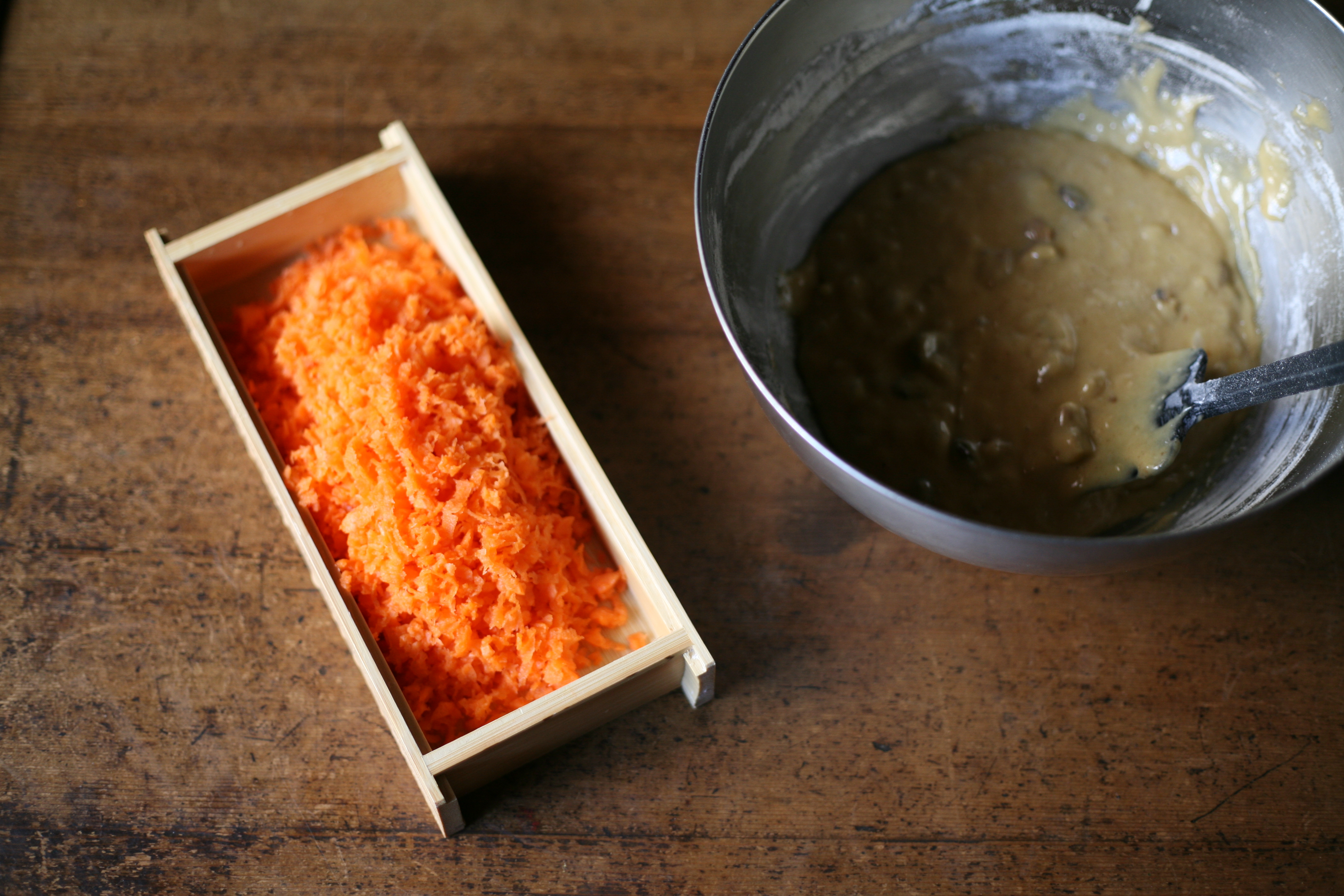 6. 5のボウルに1の人参と2の粉類を入れてヘラで切るようにして混ぜ、クルミ、レーズンなどのナッツを加える。