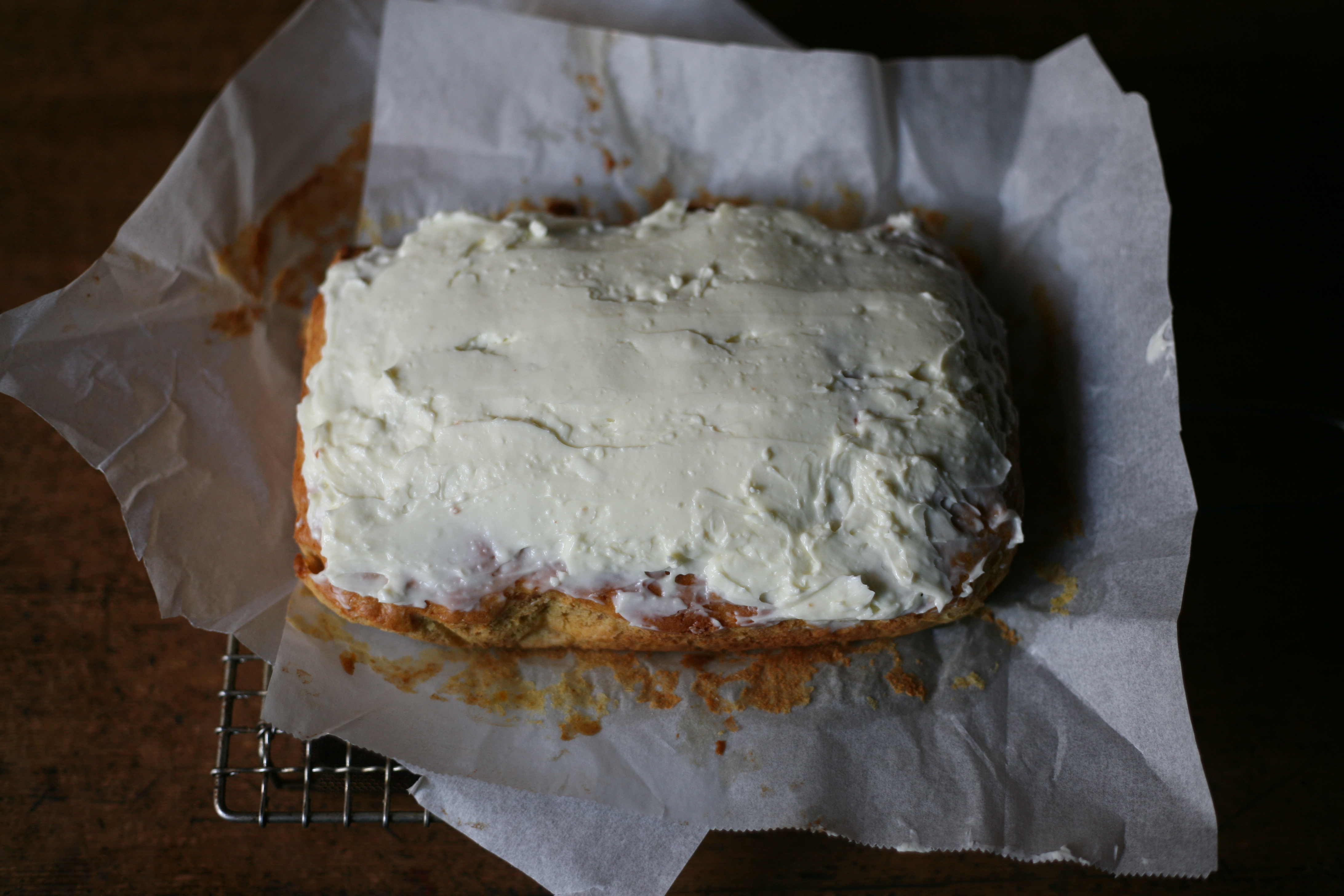 10. 完全に冷ましたキャロットケーキに9を塗り、可能であれば冷蔵庫で30分冷やす。