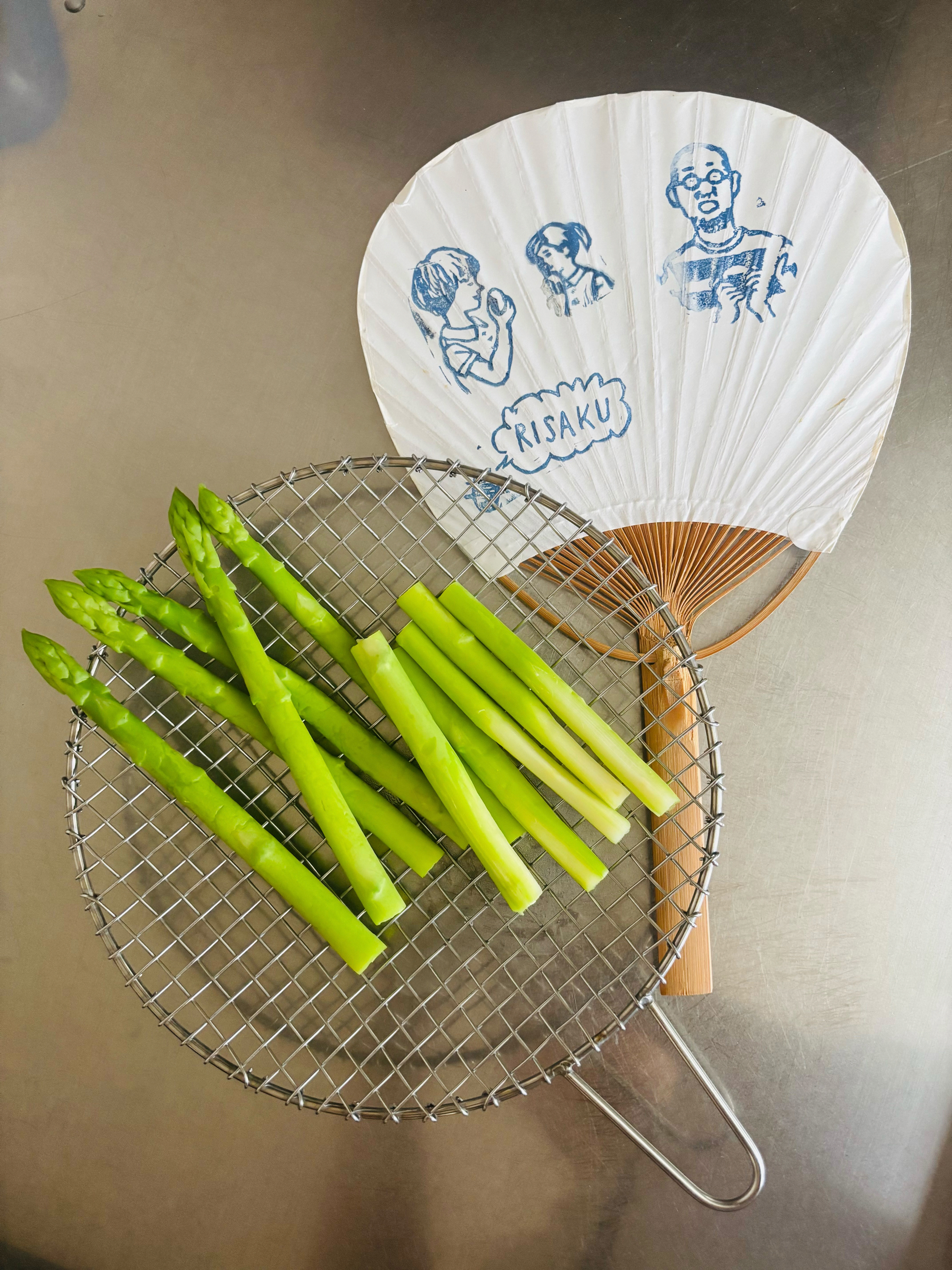 我が家では台所に小さなうちわを常備していて、下準備にもとても重宝しています。これは近所のおにぎり屋さんで、好きなスタンプを押していいよと、幼かった子どもへのお土産に頂いた思い出のうちわ。小回りの利くミニサイズはとても使い勝手がよく、台所が定位置となりました。