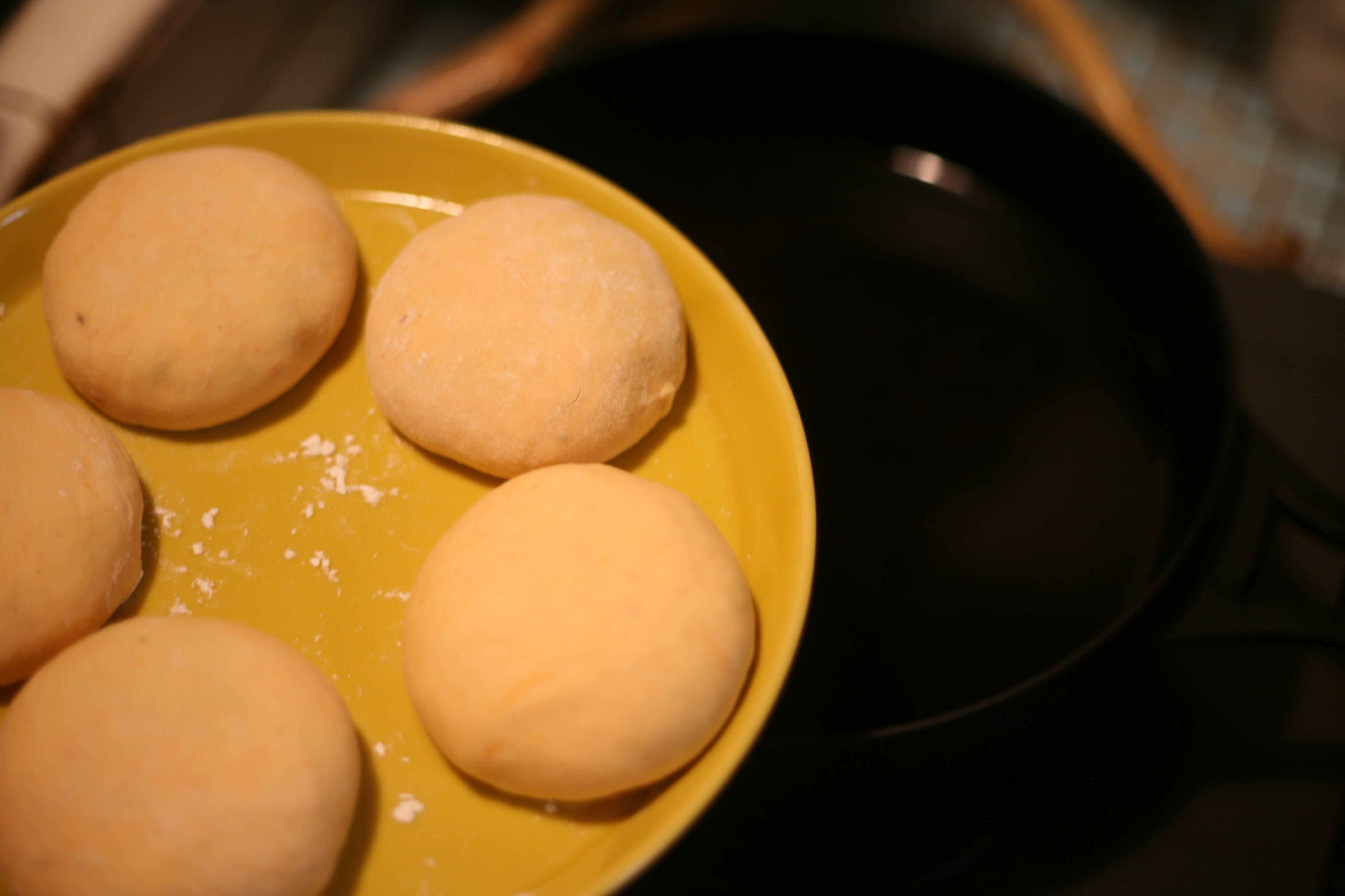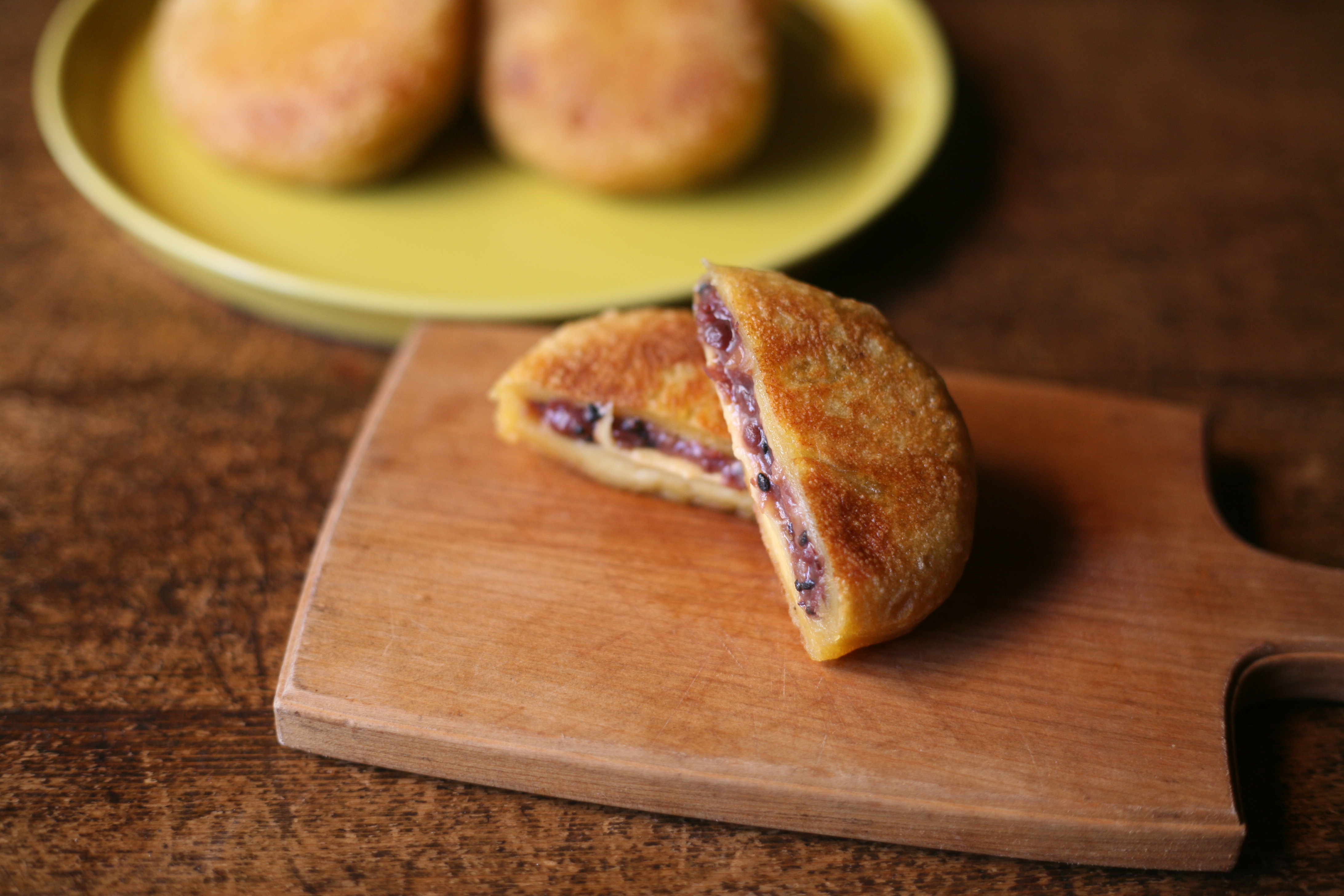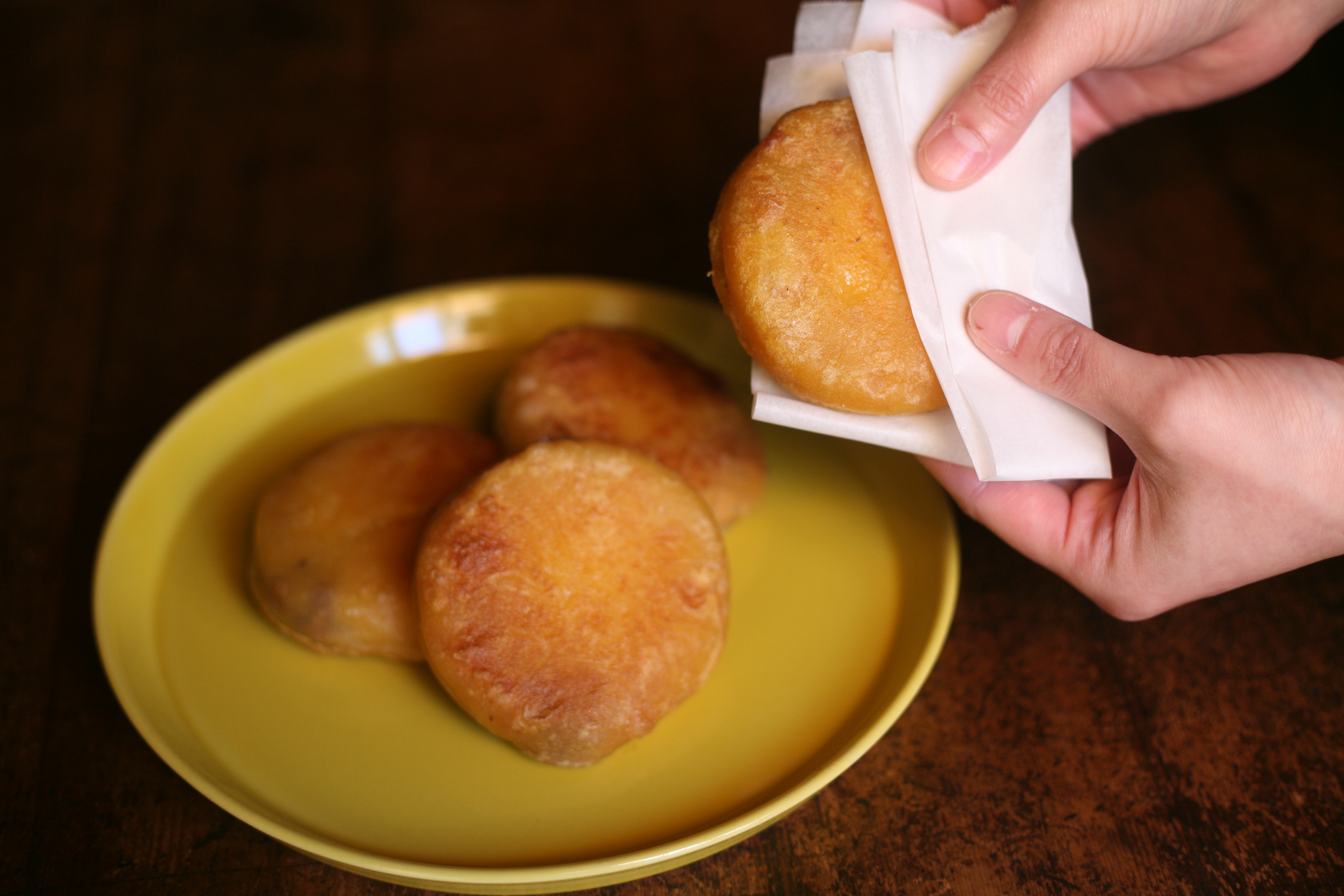 生地を丸めて平たく伸ばし、餡を入れて包む。