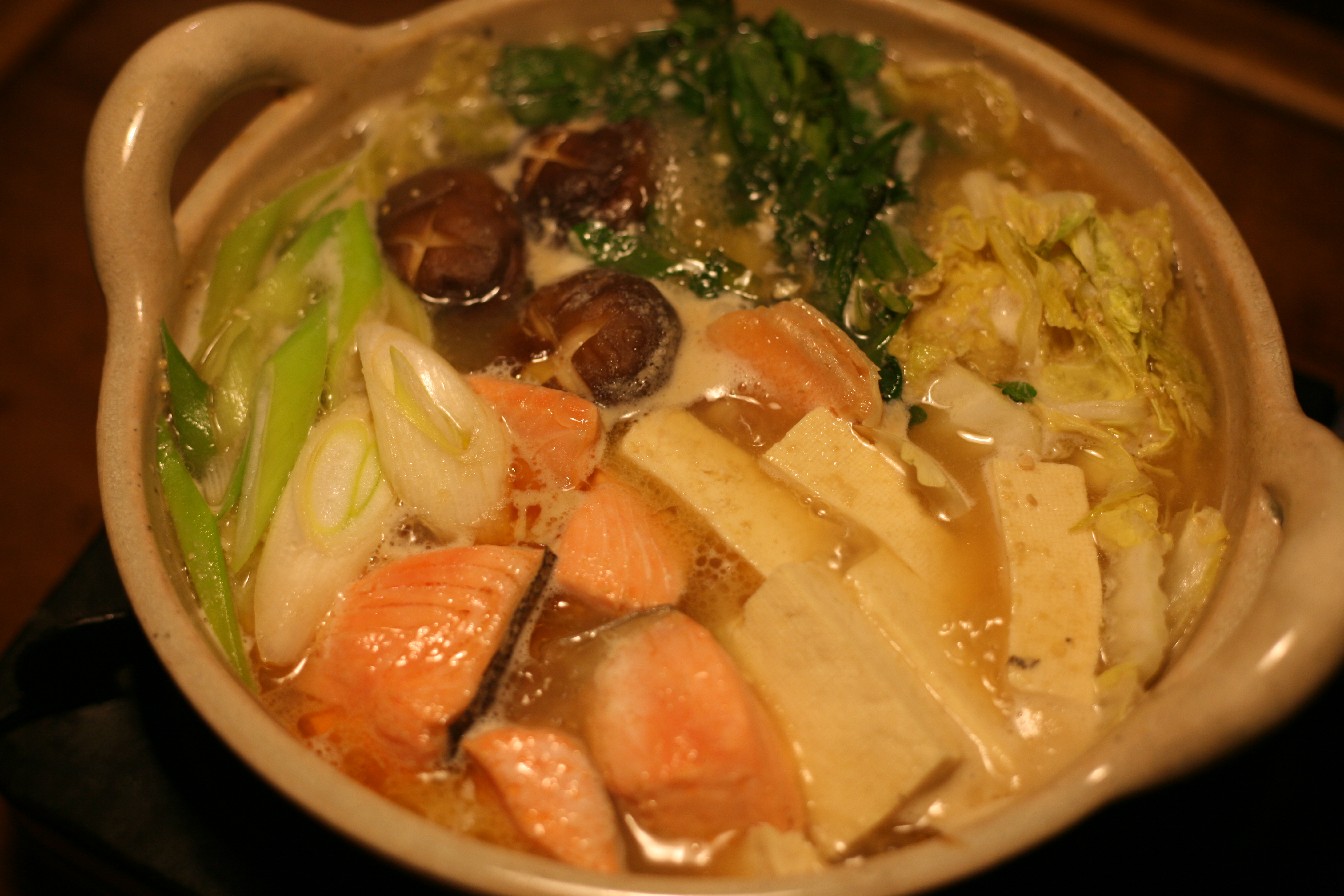 石狩鍋は、江戸時代からサケ漁が盛んな、北海道は石狩町発祥の漁師料理。サケ漁の合間に、新鮮なサケを余すところなく鍋で味わったのが始まりといわれています。その後明治に入り、地元石狩町のサケ・マス専門料亭である「金大亭」が少しアレンジを加えて提供したことで、漁師以外の方々にも広まっていきました。サケで提供するのが一般的ですが、マスの石狩鍋もあり、こちらもあっさりとしていて美味しいです。