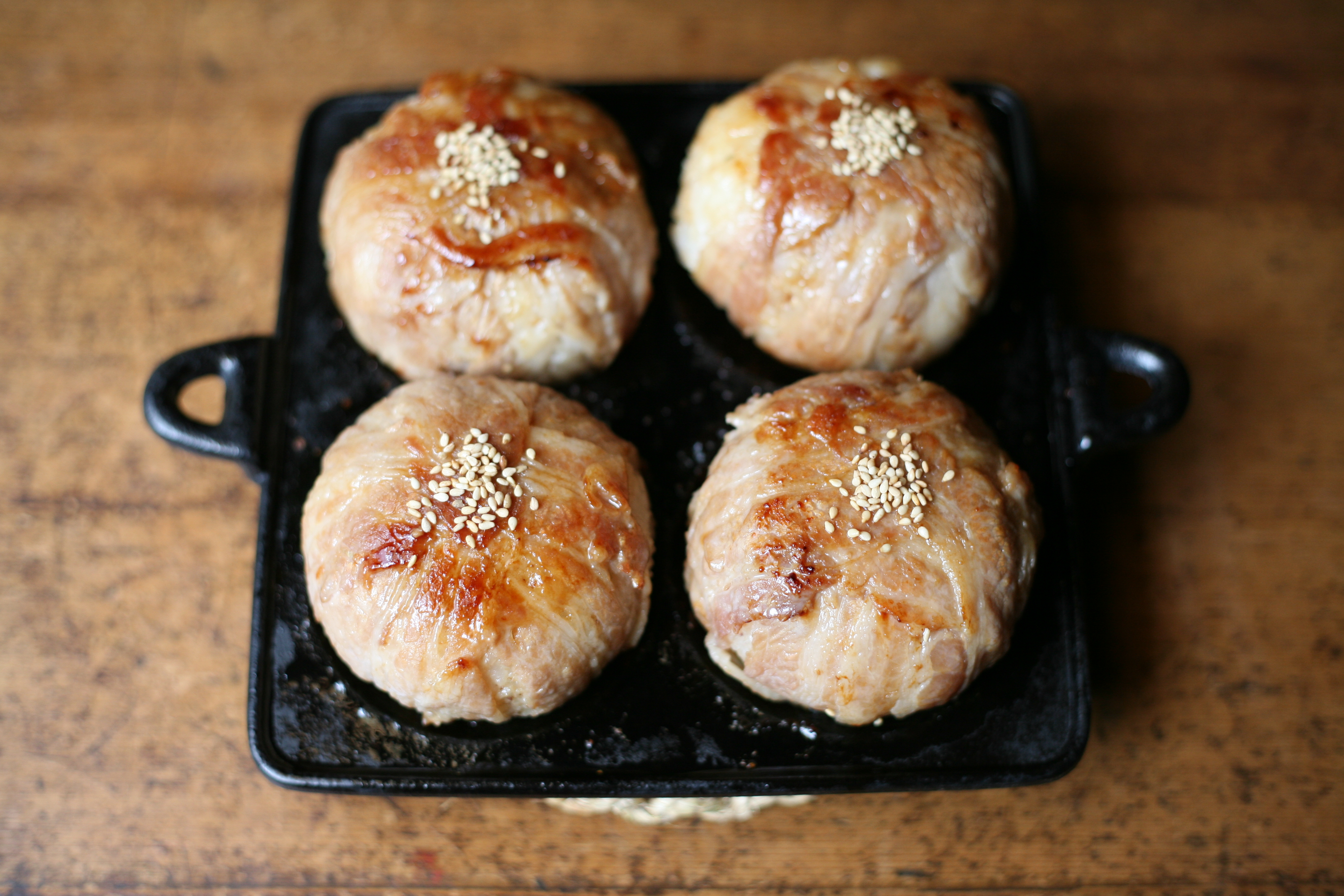 たれに漬けた豚肉をおにぎりに巻いたあと、表面に少量の水溶き片栗粉を塗ることで、ひっくり返しても豚肉がおにぎりから外れにくくなります。刷毛でたれを塗りながら、表面を色よく焼いたあとは、側面の豚肉にも火を通し、白ごまをトッピングして出来上がり。おにぎりは、ごまのほかに削り節や市販の粉末だしを混ぜてアレンジしても美味しいです。