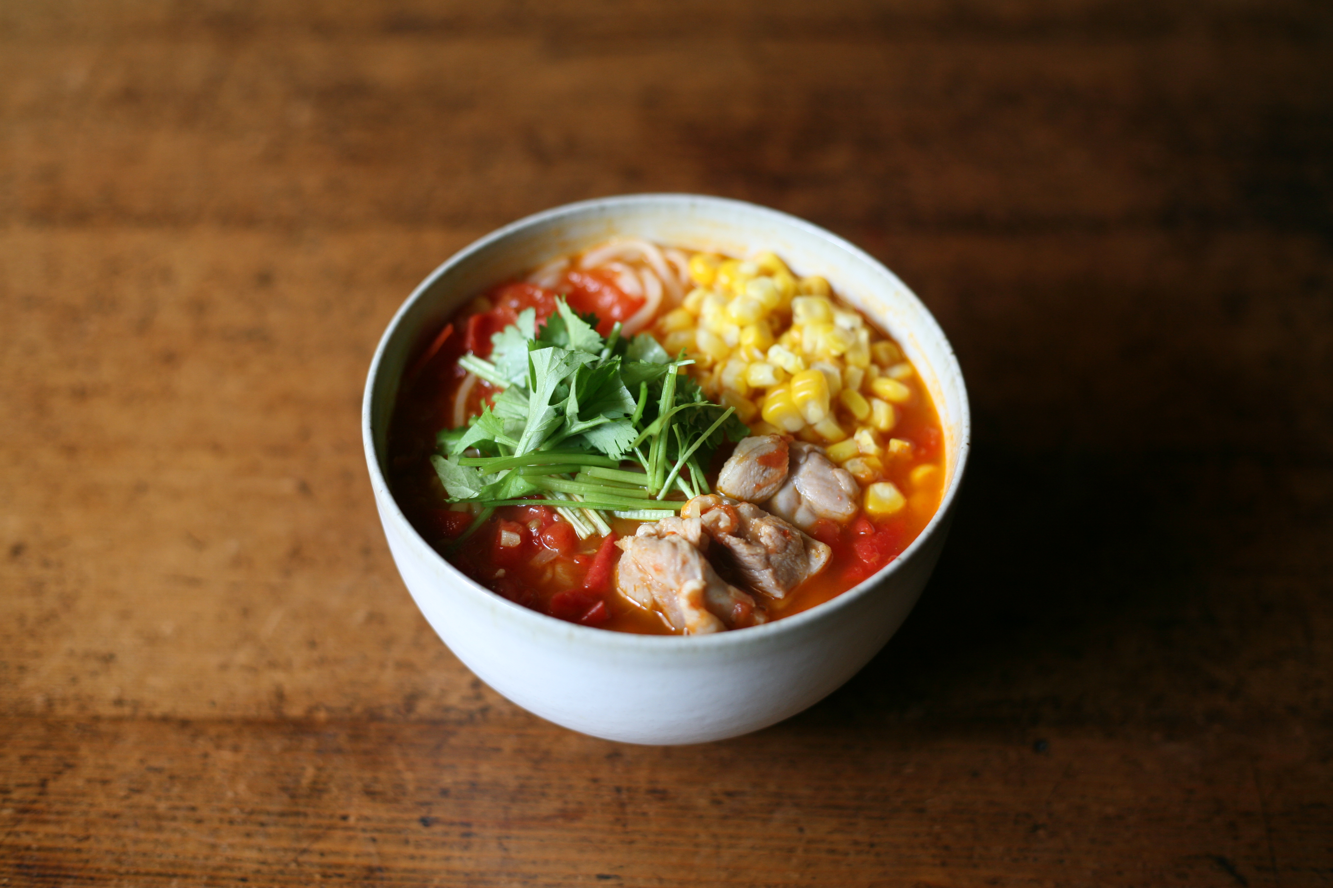 9. 器にうどんとスープを入れ、とうもろこし、パクチーをのせる。