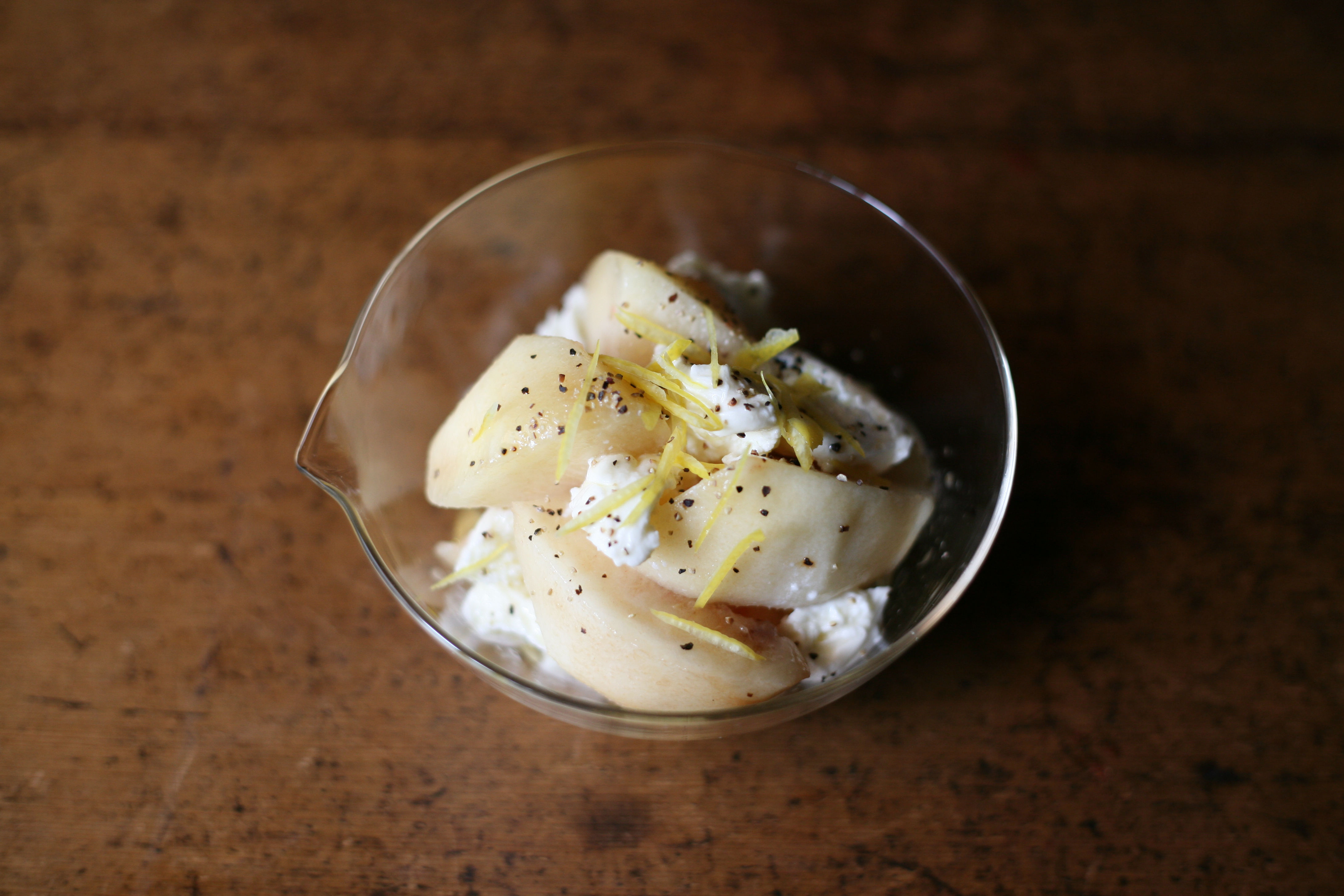 旬の桃とモッツァレラチーズの組み合わせ、オリーブオイルと塩胡椒によるサラダのような味わいがとても新鮮で、白ワインやシードルと一緒に食べても美味しそうです。