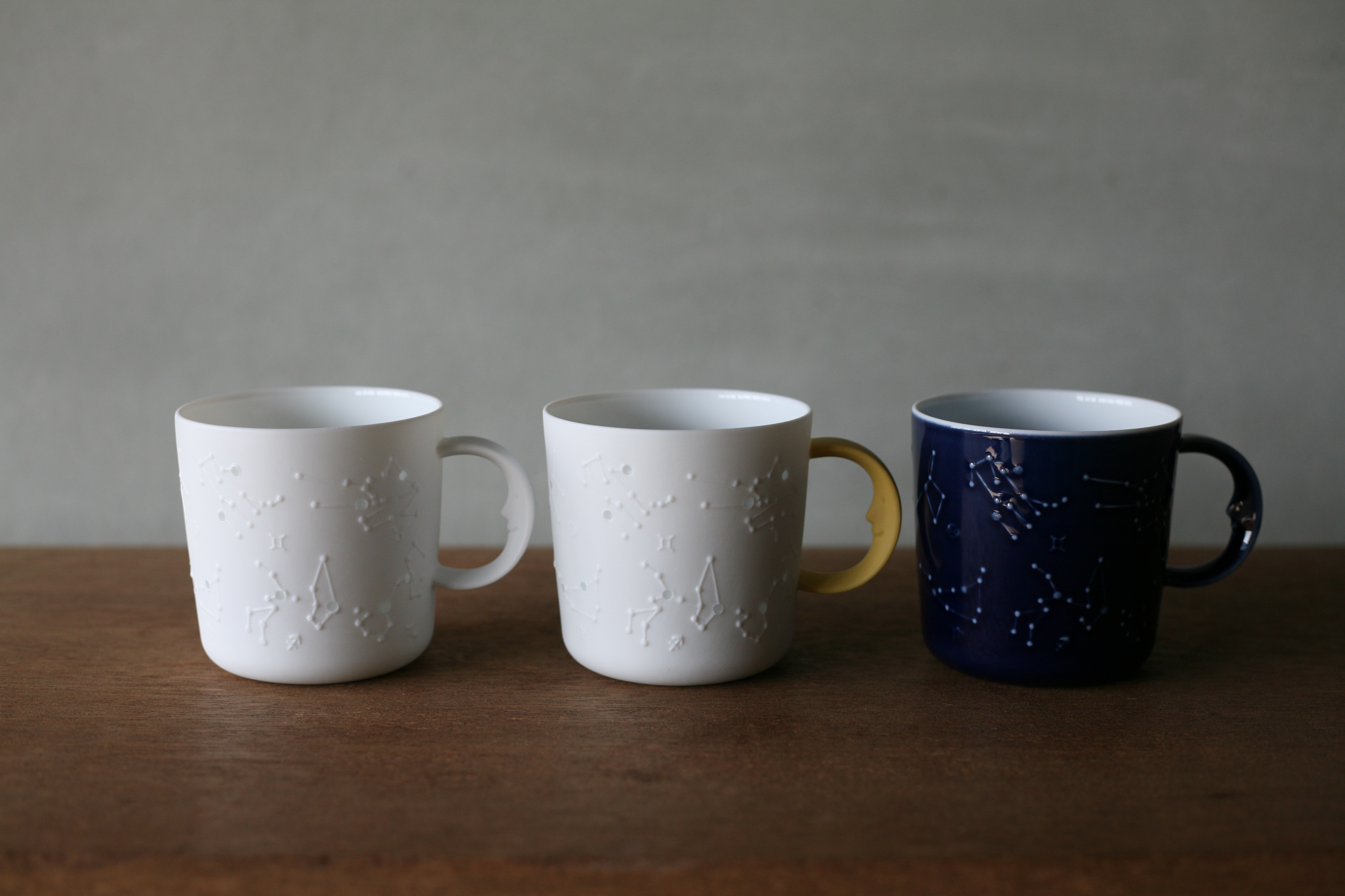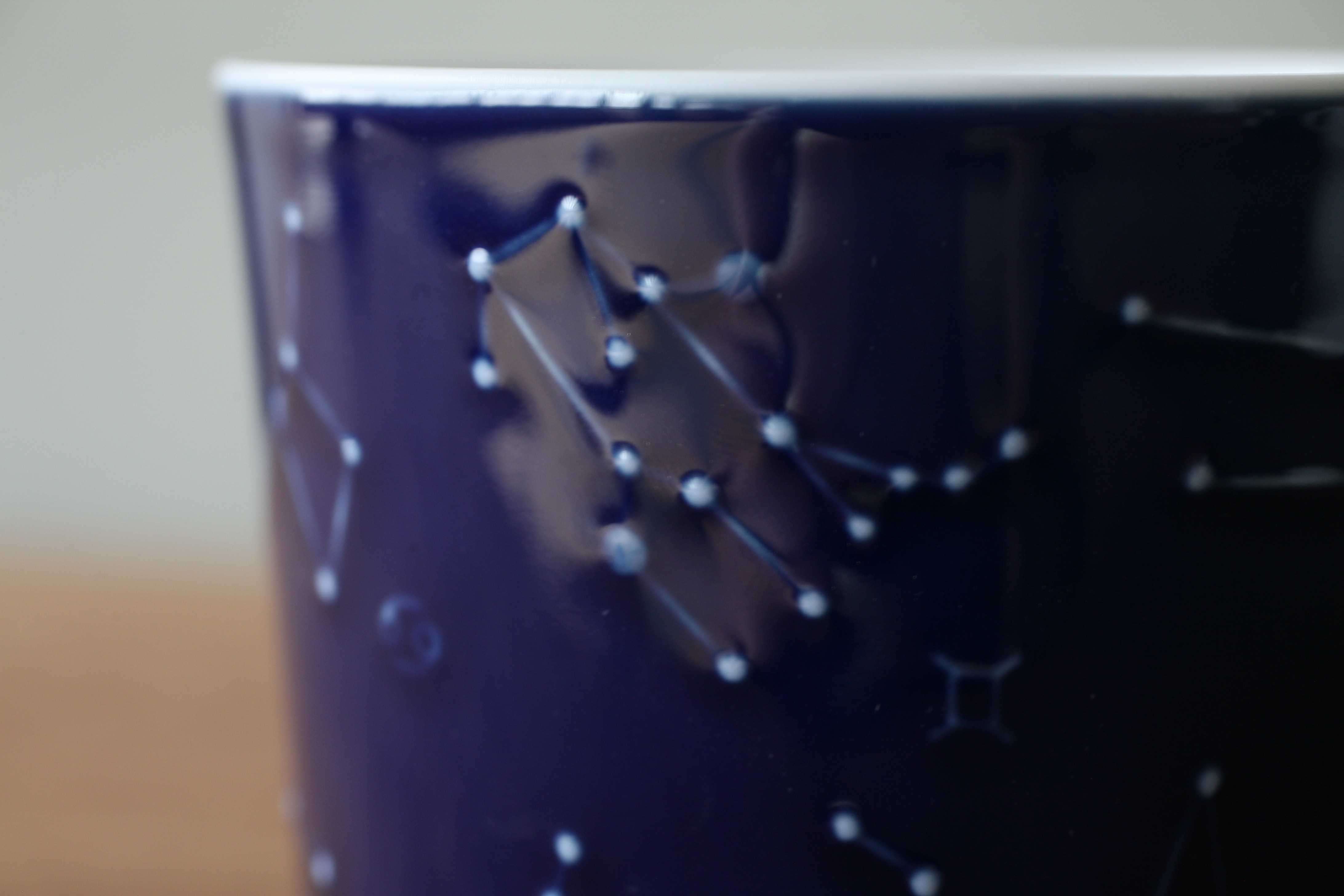 セラミック・ジャパンの星座マグ(白と黄色)は光に照らすといくつかの星が明るく光ります。蛍手という技法により、職人が一点一点透かし彫りを施した上に透明釉をかけて焼き上げています。マグに浮かび上がる十二星座と夜空の星を見上げながら、ほっと一息つきましょう。