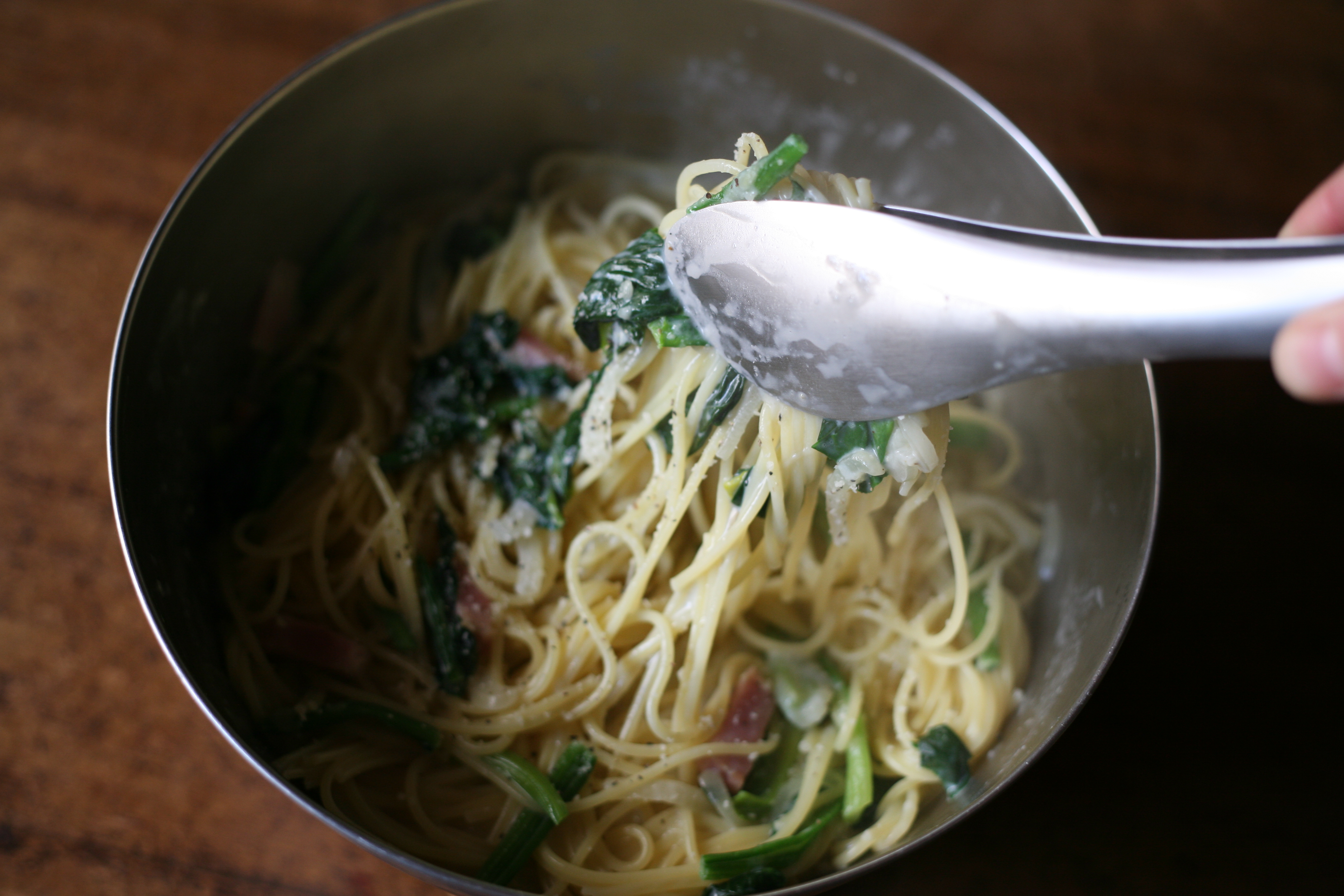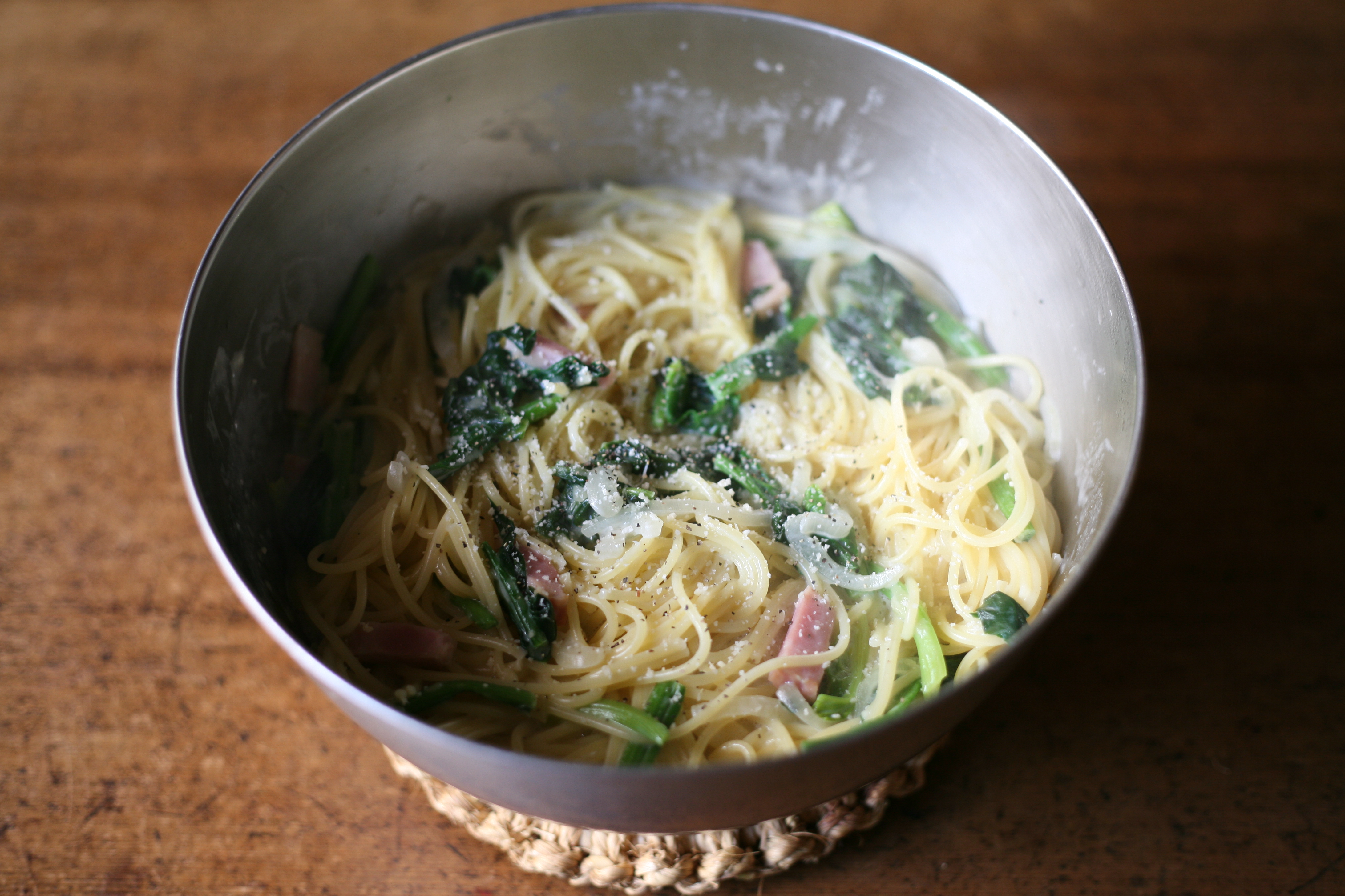そんなときに、私たちが愛用しているのが、柳宗理のステンレスボール23cm。ボウルにザルをセットし、パスタをお湯ごと空けて、お湯を切ると同時にボウルを温めておきます。そして、お湯を流したボウルにパスタとソースを入れて混ぜたら、そのまま器として食卓へ。今日は取り分けできる大盛りパスタの気分、そんな日には欠かせないアイテムです。