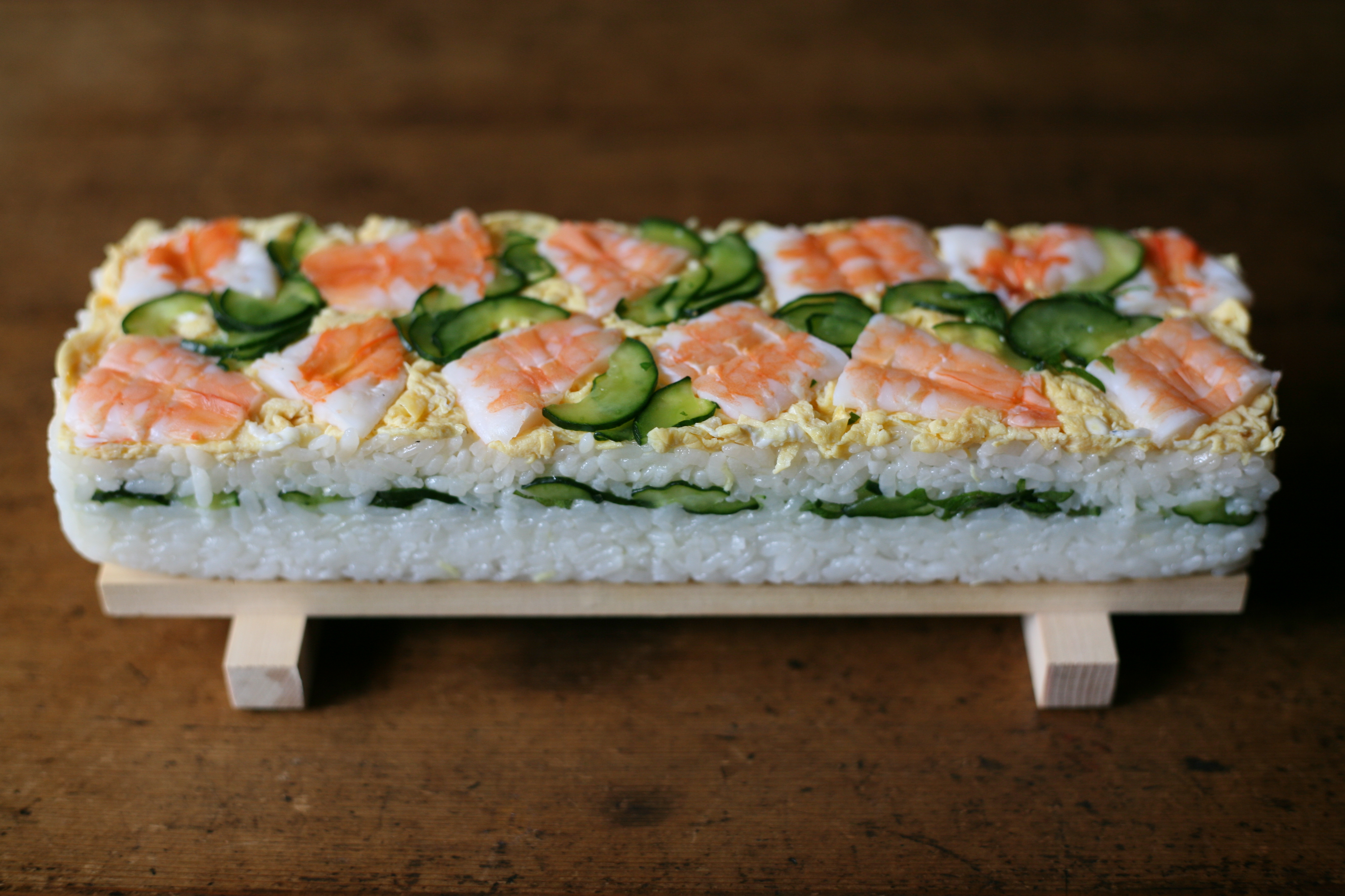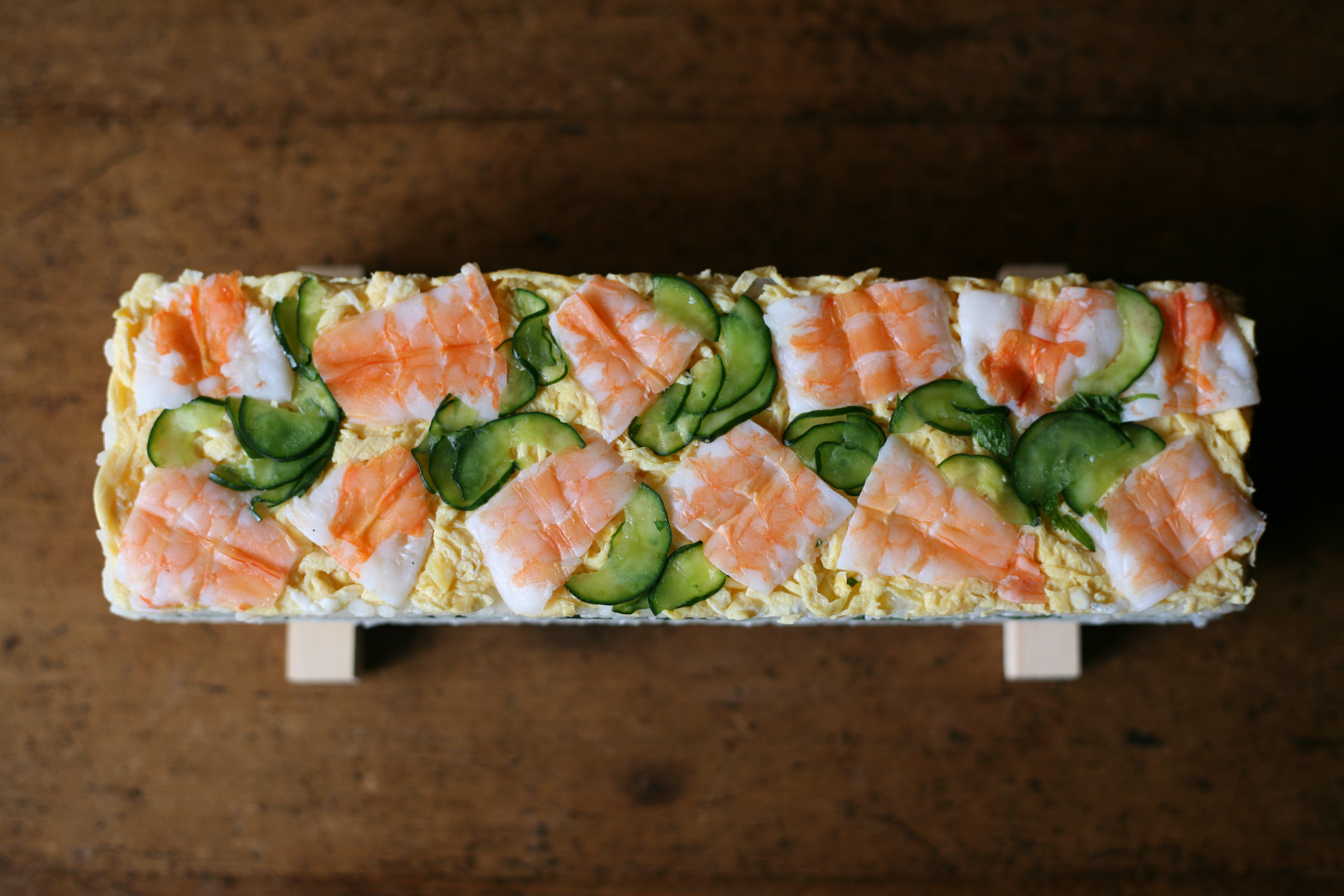 4. 押し寿司型に、食べやすくカットした海老、きゅうりをバランスよく並べ、錦糸玉子を敷き詰める。