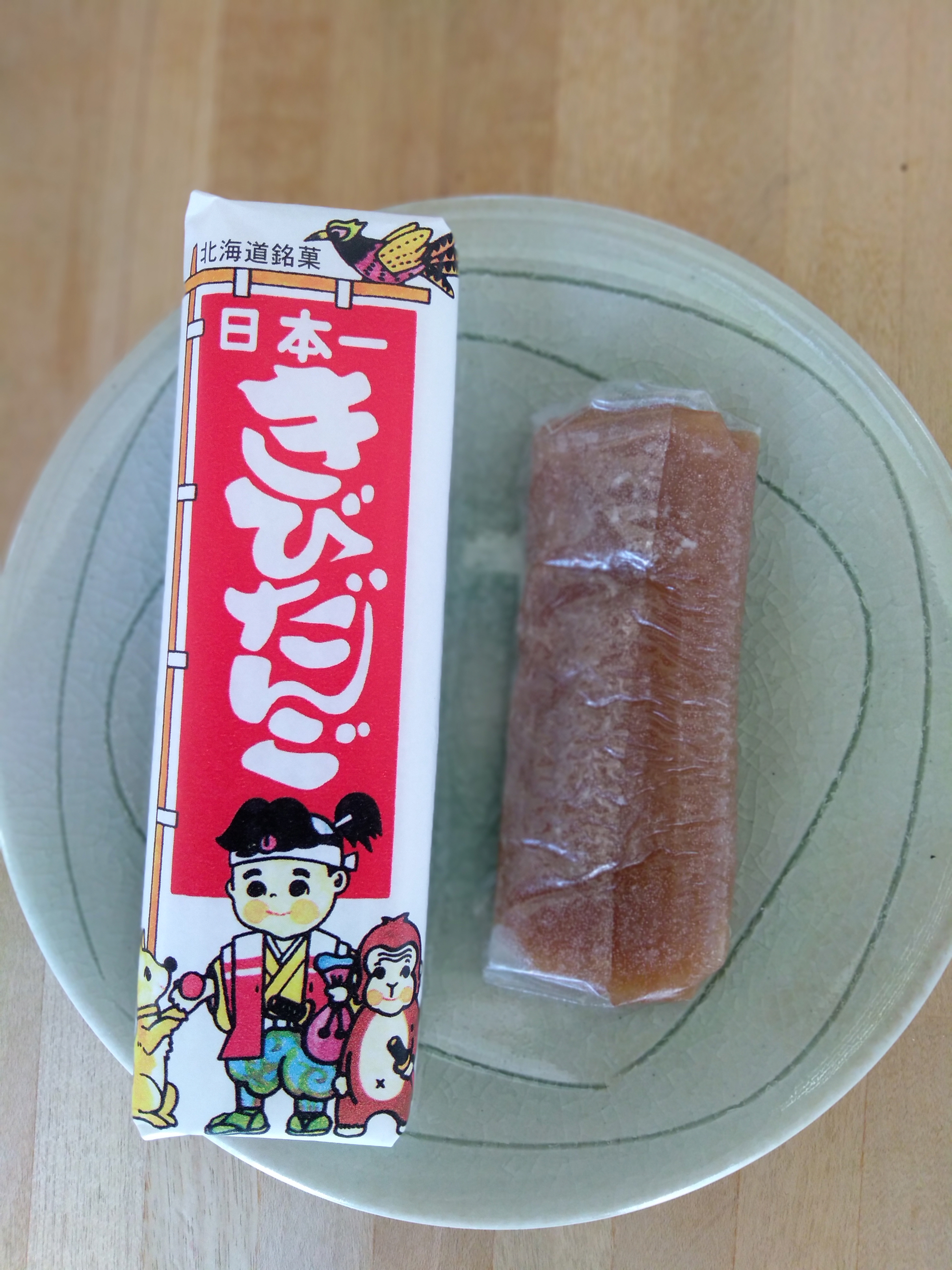 しかし、遠く離れた北海道の地に定着した「きびだんご」があるのをご存じでしょうか。北海道の「きびだんご」はお土産物としてというよりは、スーパーやコンビニのお菓子コーナーに当然のように置かれている、日常のおやつとしての位置付けです。その形は、岡山県の「きび団子」が昔話の挿絵に描かれているような丸い形をしているのに対して、北海道の「きびだんご」は長方形の紙に包まれた平べったい形のもの、一口タイプの商品は小さめの細長い形で、一つ一つ個包装されていて持ち歩きにも便利です。そして、どちらもオブラートに包まれているのも特徴です。この丸くない形状なのになぜ「だんご」というのか…実は、「団子」ではなく「だんご」だからなのです。