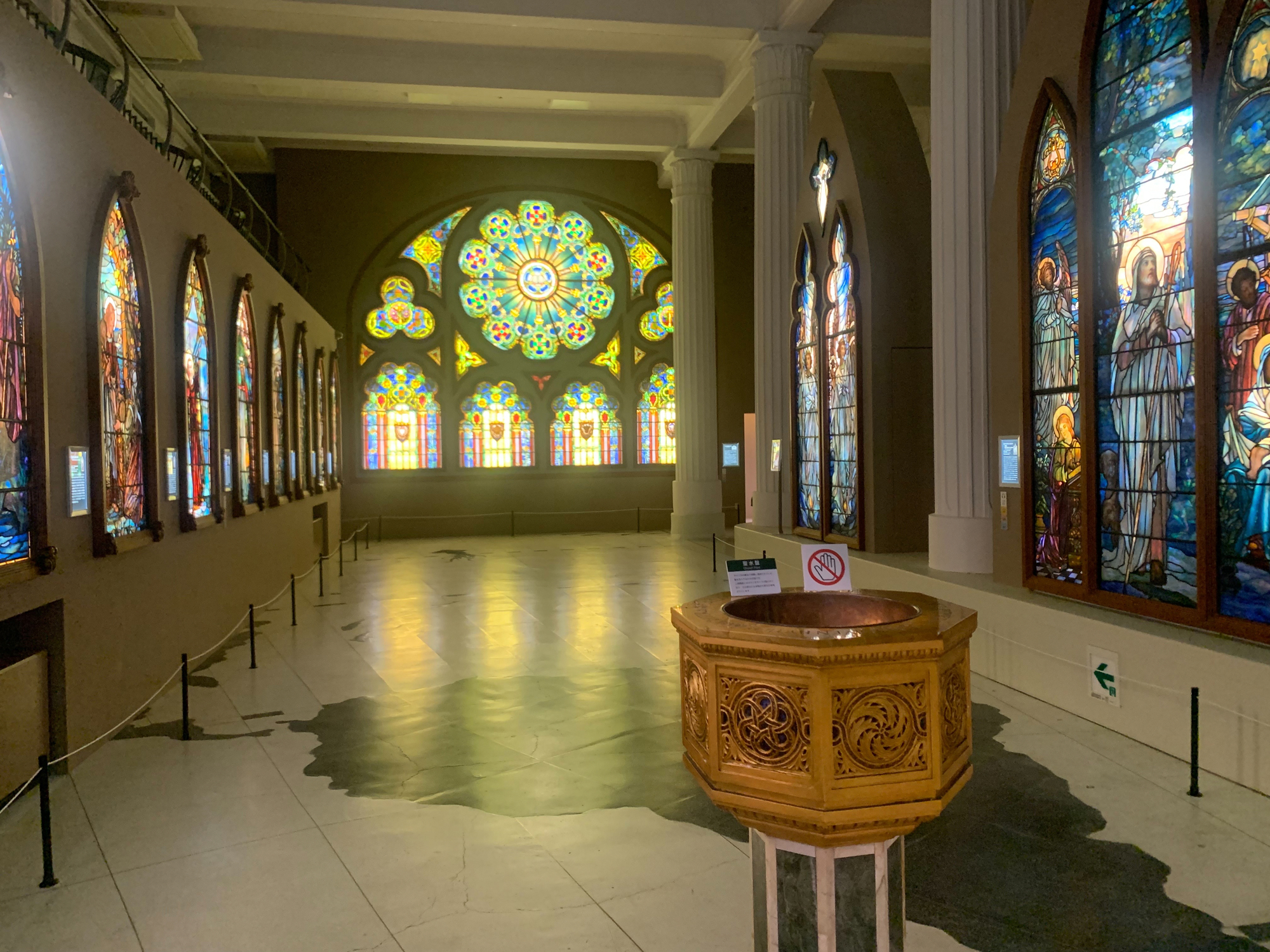 そんな建物の中には、ニトリの創業者である似鳥昭雄氏によって収集されたさまざまなジャンルの作品が収められています。まず1階から2階までの吹き抜け部分には、ルイス・C・ティファニーのステンドグラスが展示されています。かつてアメリカのニュージャージー州にある教会の窓を飾っていた色彩豊かなステンドグラスは圧巻です。多種多様な色ガラスを使用する技法についての解説を読むとぐっと鑑賞の深みが増します。続く展示室は4階から階を下る順路を取ります。4階に横山大観などの日本画、3階に岸田劉生などの西洋画、2階に高村光雲などの木彫といったテーマごとの展示室が設けられ、さらに2階と地下1階に企画展示室が設けられています。私が訪れた際の企画展示室では、2階では山下清作品、地下1階ではガンダーラの石像や、「せんとくん」のデザインを手がけたことでも知られる薮内佐斗司の作品、ガラス工芸などが展示されていました。個人的に特に印象に残っているのは高村光雲とその弟子たちによる木彫作品でした。ちょうど、小樽ショールームでここかしこの雲棚を見た感動が冷めやらぬタイミングであったため、木彫というものにすっかり魅了されてしまいました。展示室ごとに雰囲気が変わっていくので、ボリュームのある展示も疲労感をあまり感じずに楽しむことができました。