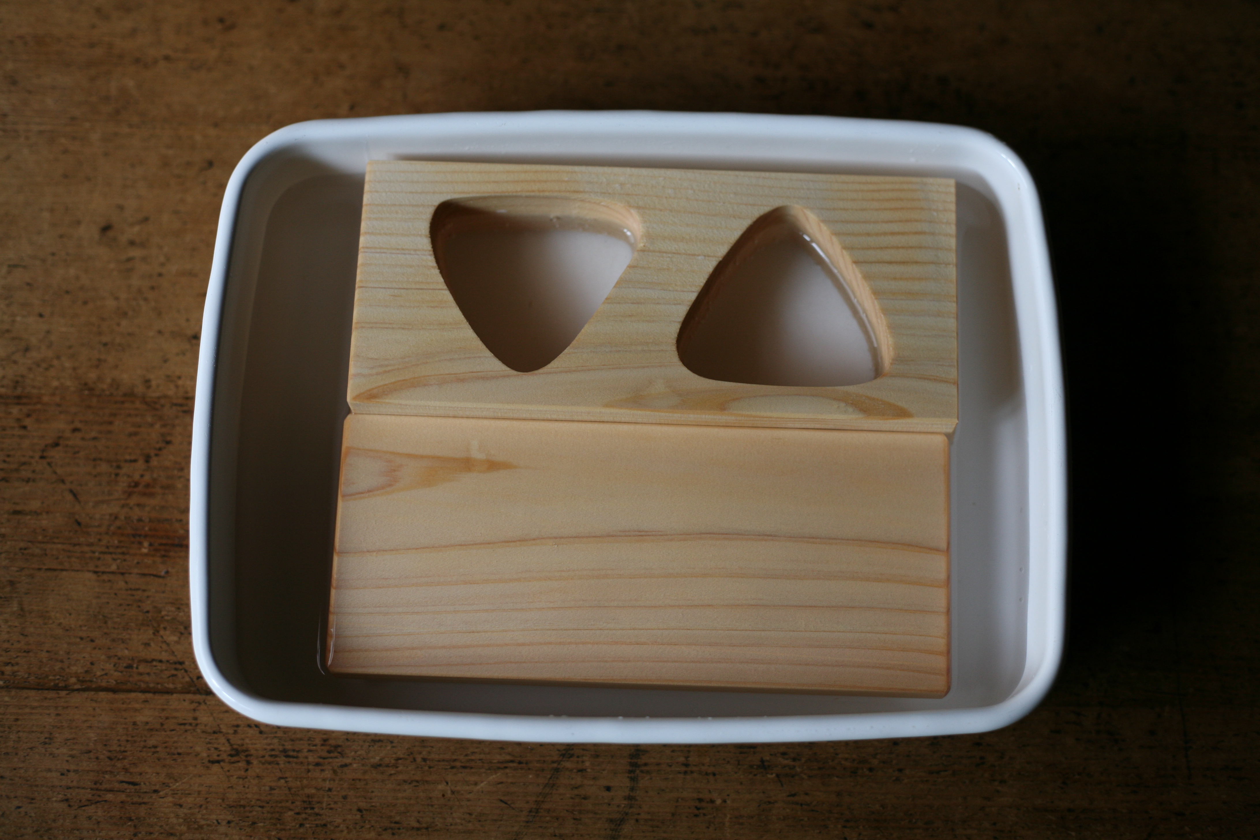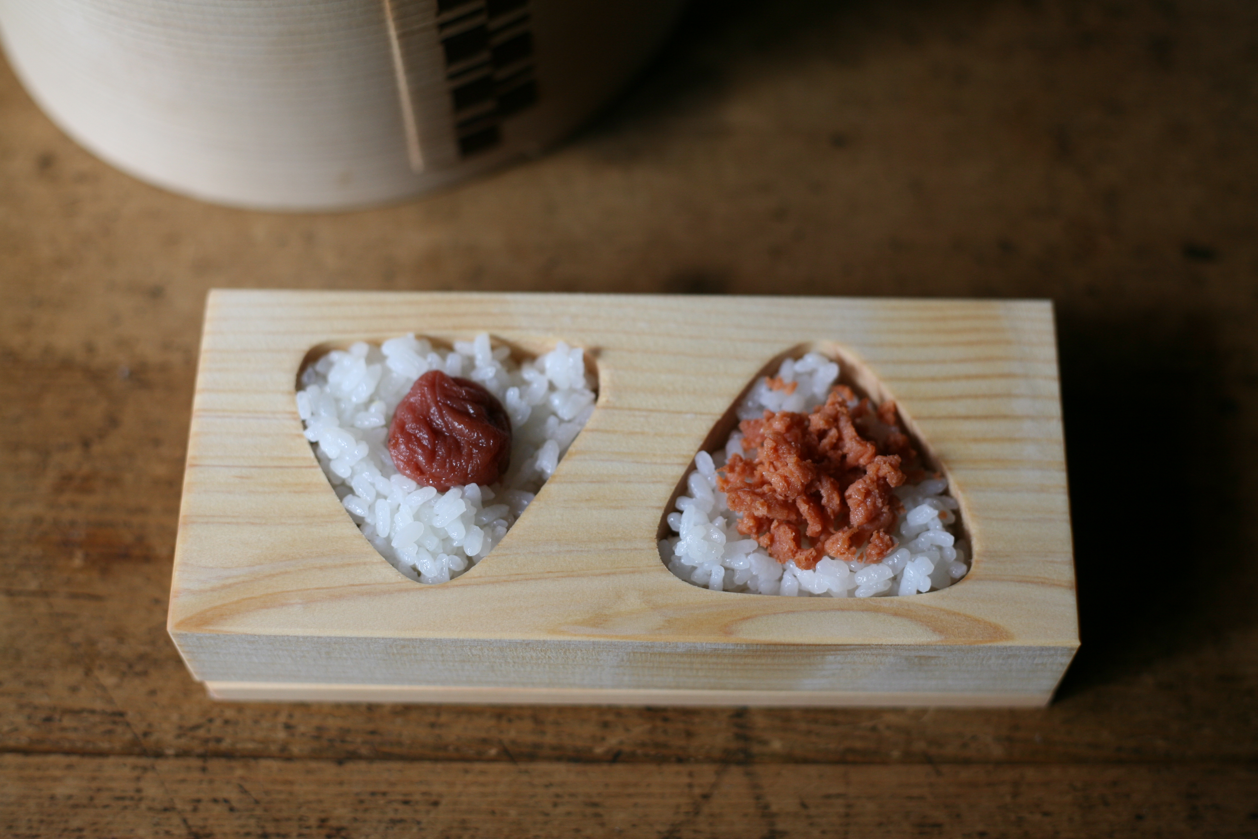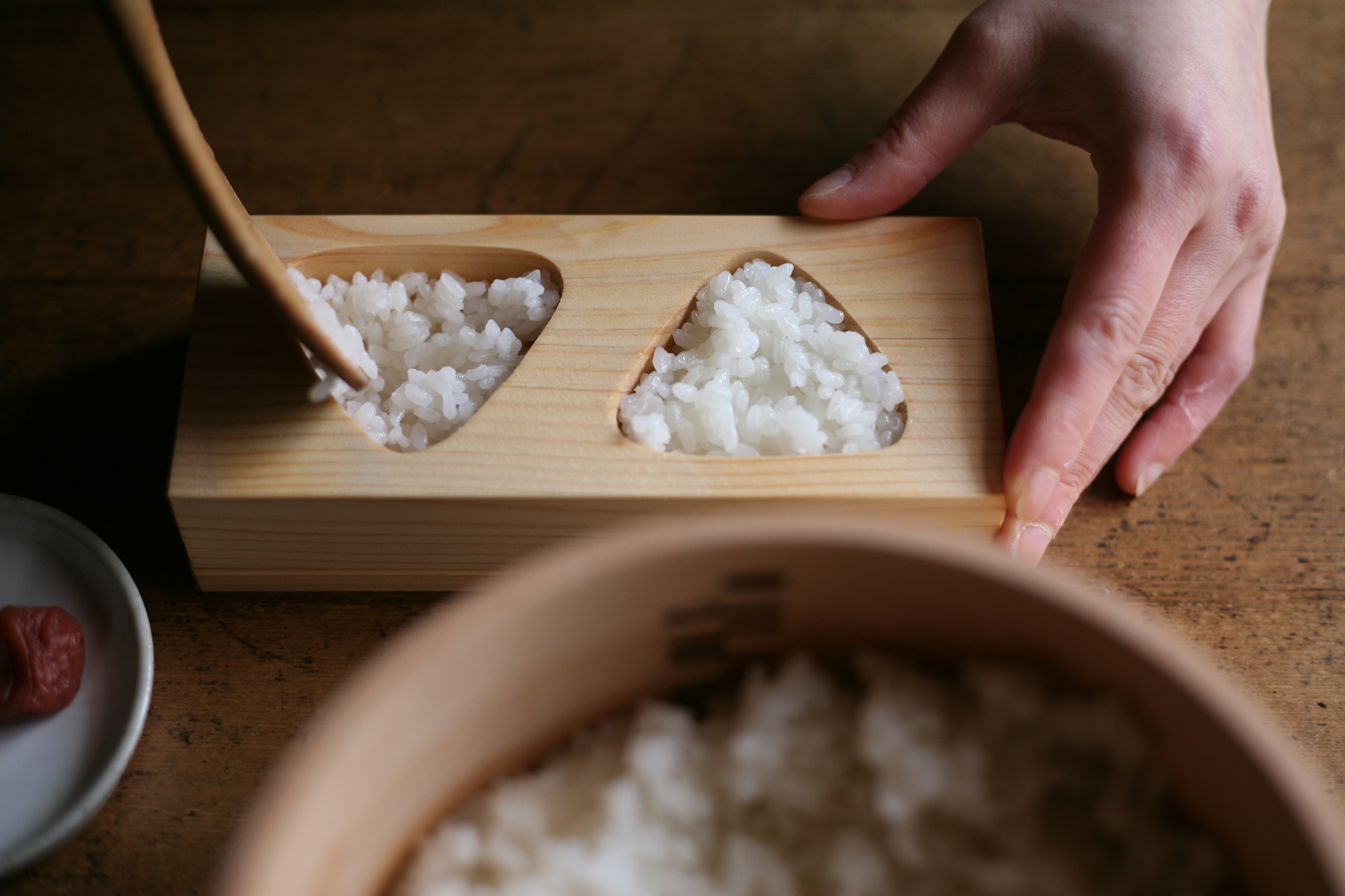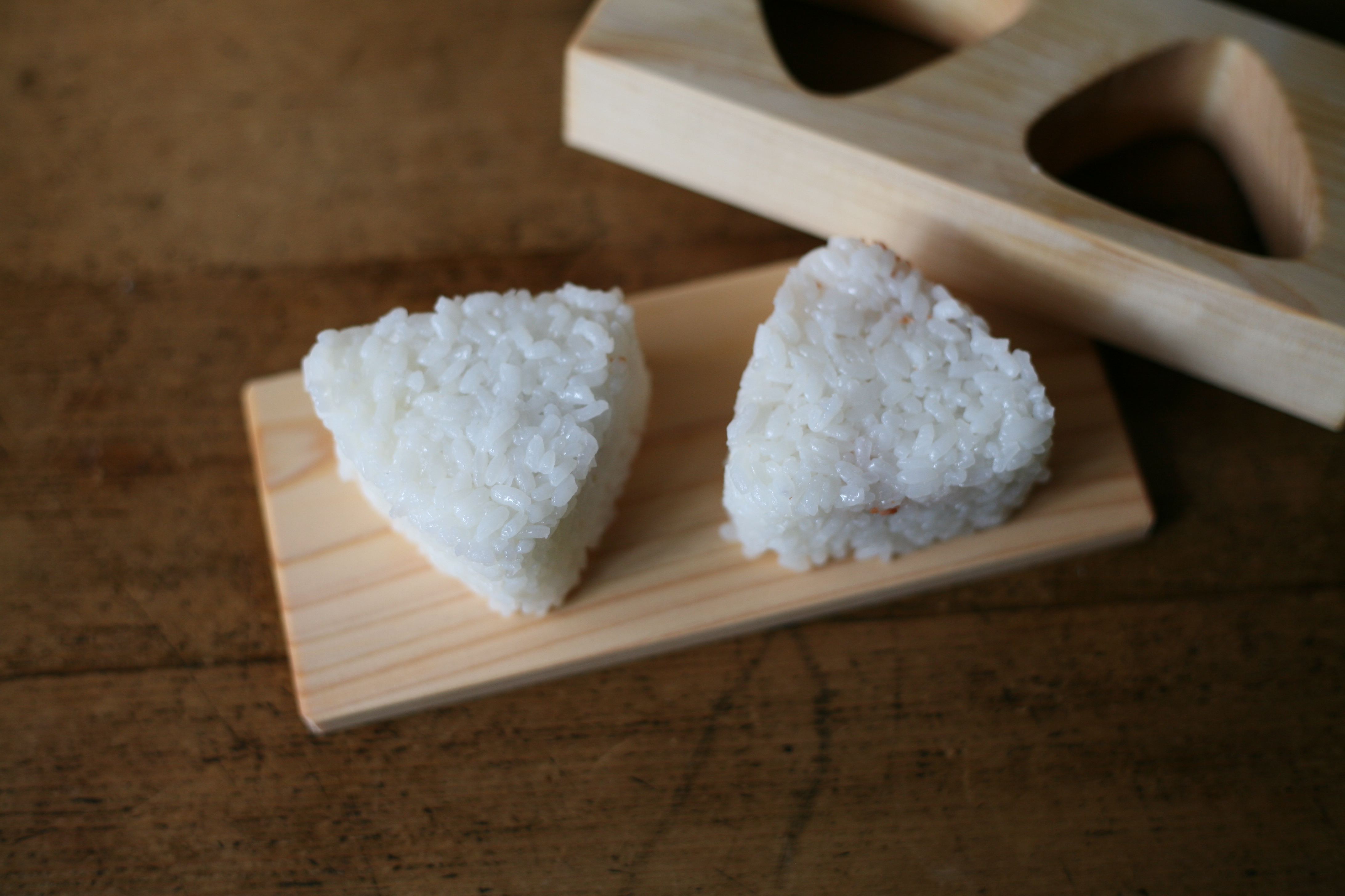 そんなときはこの「三角おにぎり型」を使ってみてください。三角型のおにぎりを一度に2個作ることができます。サイズは小ぶりに見えますが、お弁当やちょっと小腹が空いたときにちょうど良い大きさです。国産のヒノキを使っているので、出来上がったおにぎりはほんのりとヒノキの良い香り。木が余分な水分を吸収することで、おいしいおにぎりができます。