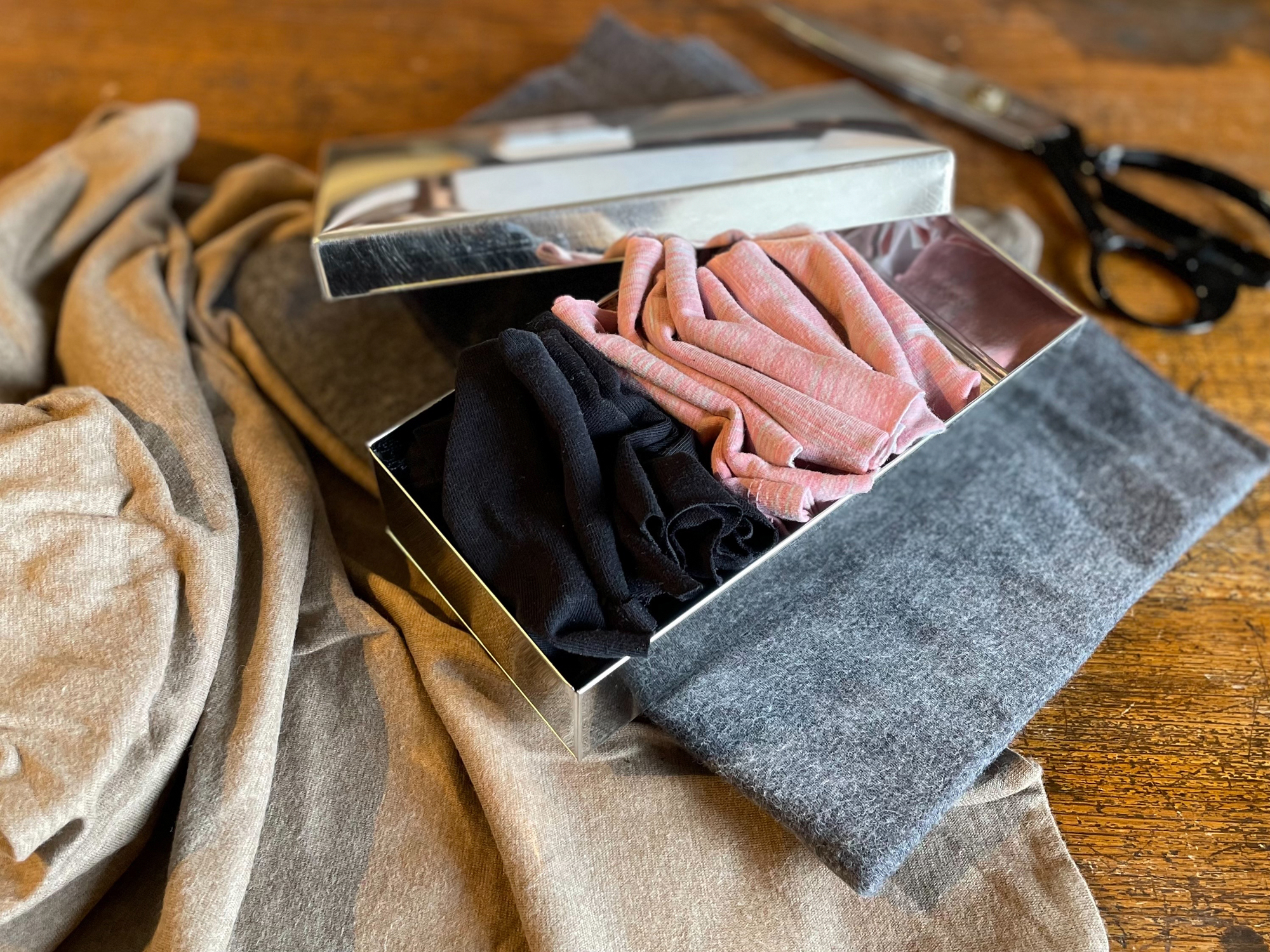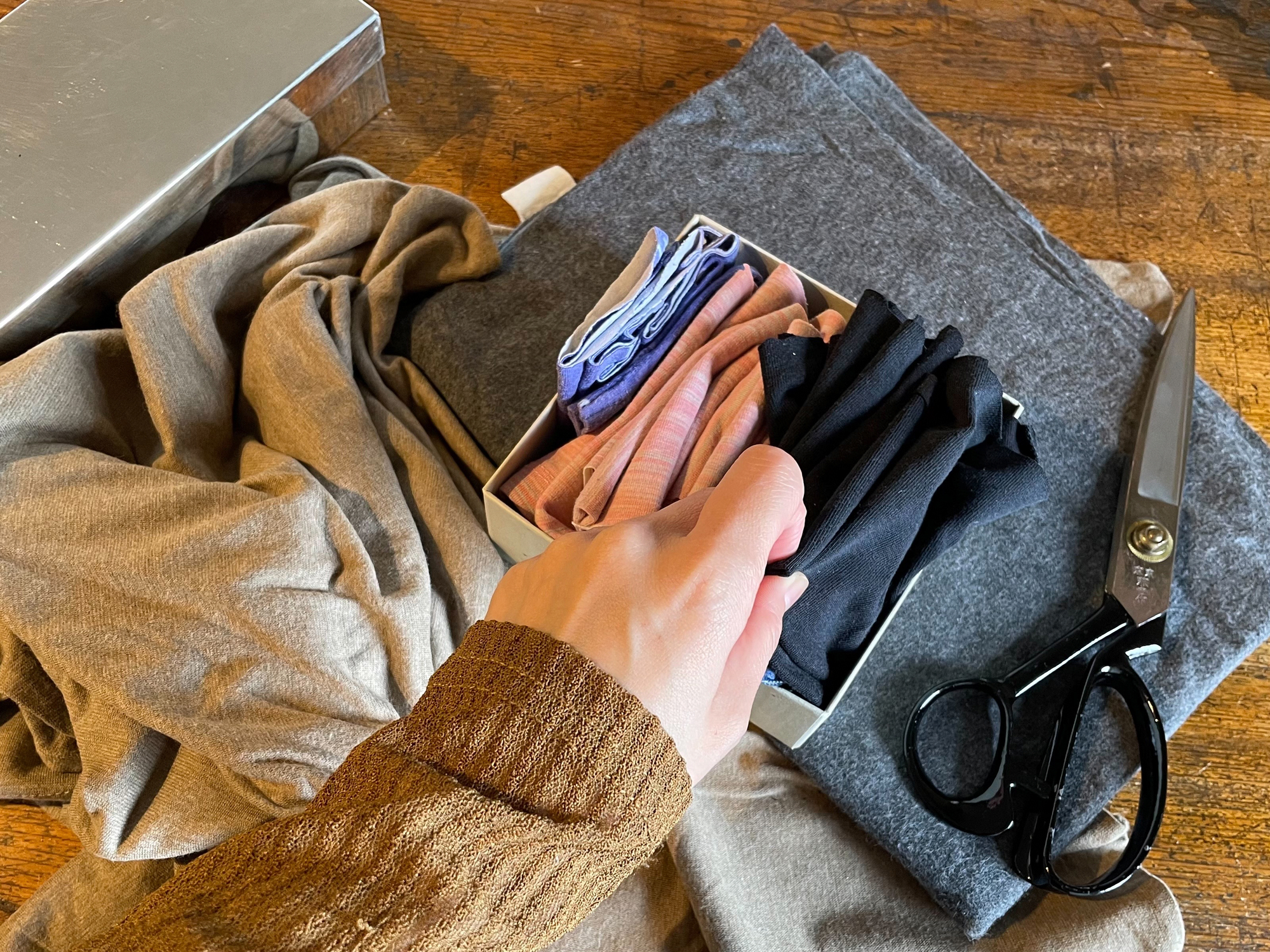 子どものサイズアウトした服、くたびれたタオル、古くなった枕カバーなど、使えなくなった布を、裁ちバサミでバシバシと切っていきます。大きさも切りやすいサイズで適当に切っていくだけ。捨てる部分が少なく切れると、これがまたスカッとするんです。お気に入りの箱や缶に入れておけば、部屋に出していても必要なときにサッと使えてとても便利です。