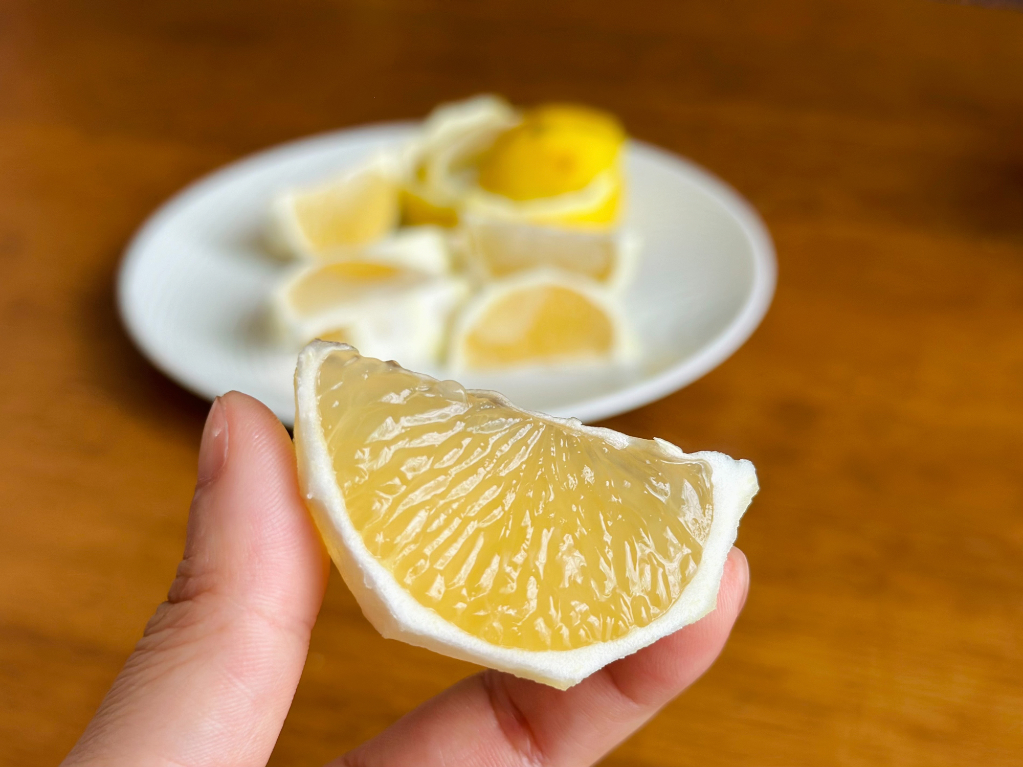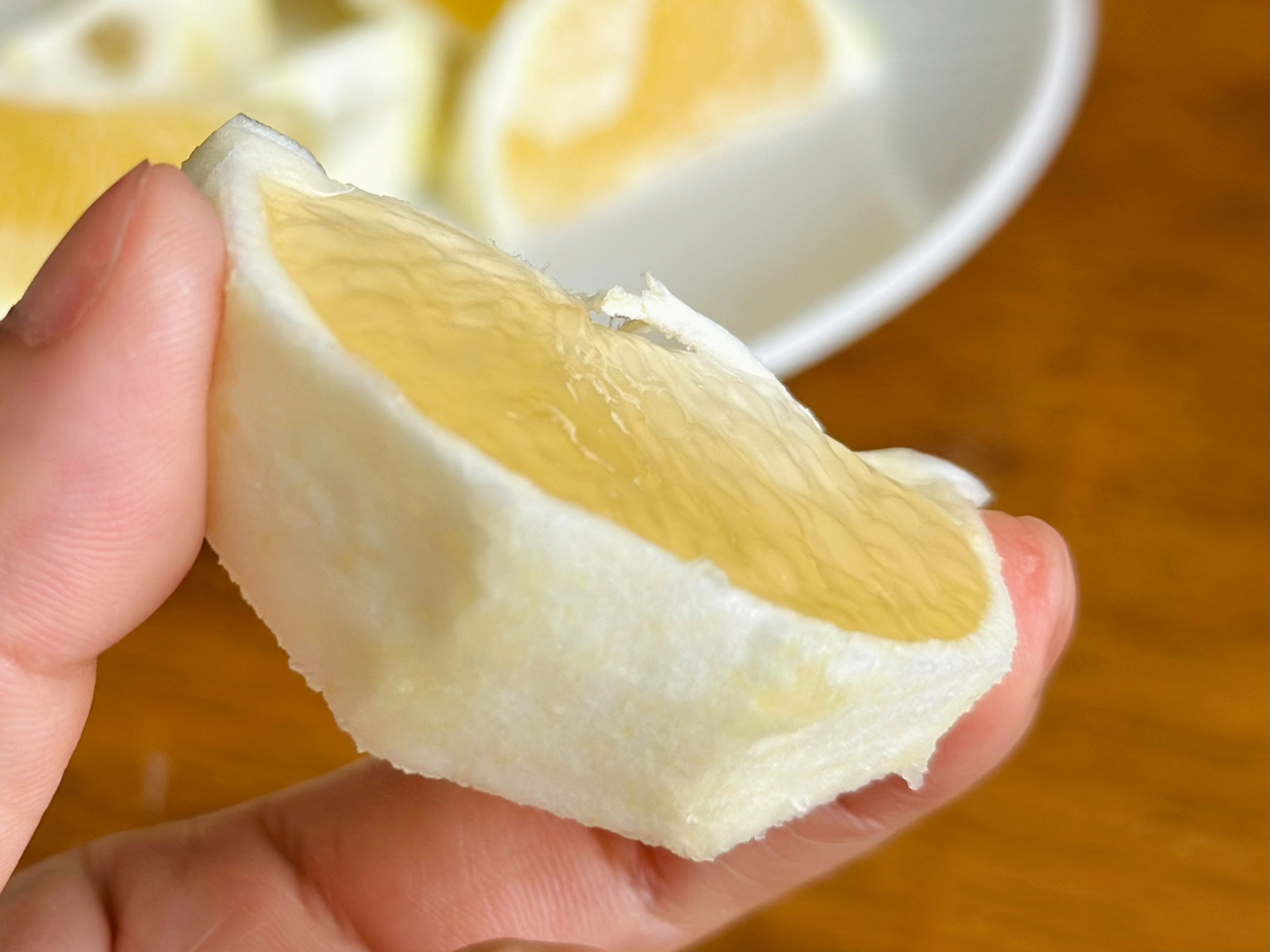 食べ方は皮を指でむかず、白い皮を残すようにりんごの皮むきの要領で、外果皮のみを薄くむきます。ふかふかの白皮(アルベド)には苦味がなくほんのりと甘いので、一緒に食べることができます。