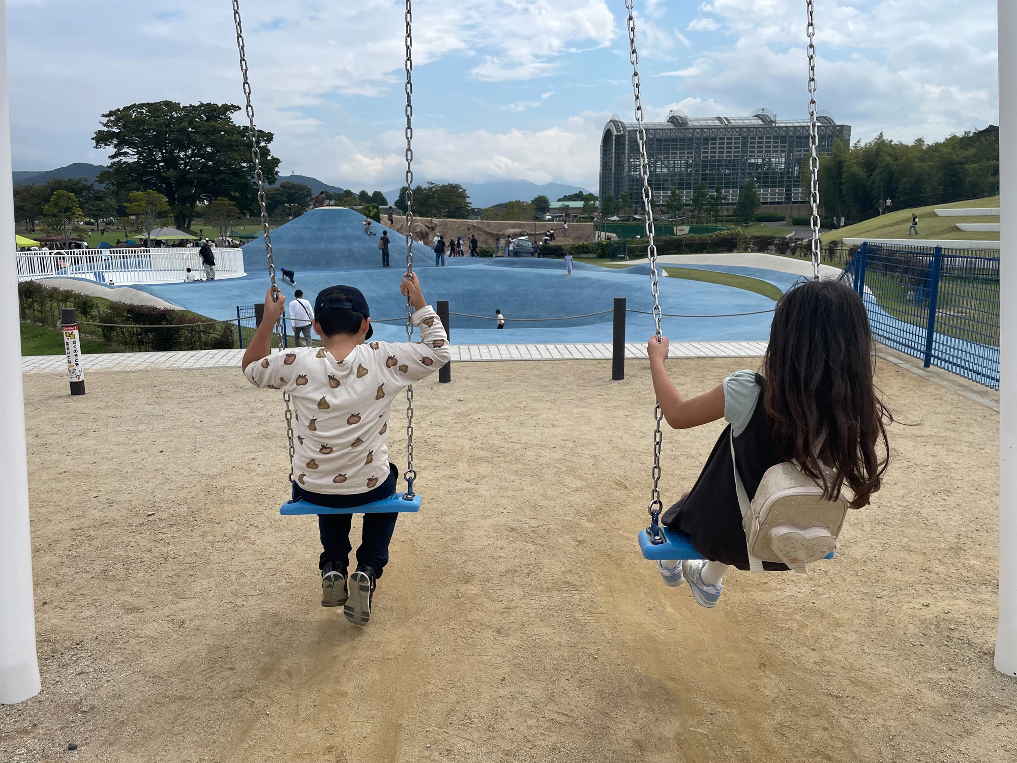 大人の私でもブランコを思いっきりこいで空まで飛んでいけそうな気分にさせてくれます。ブランコがぐるりと大きな輪になっているので、子供たちもブランコからブランコへ、景色を変えて楽しんだりもしています。昨年2023年には“公園で遊んで公園に泊まれる”キャンプ場「HIBIKINADA CAMP BASE」がオープン!1泊泊まるからこそできる遊び方や、見ることのできる公園の景色があるかもしれません。