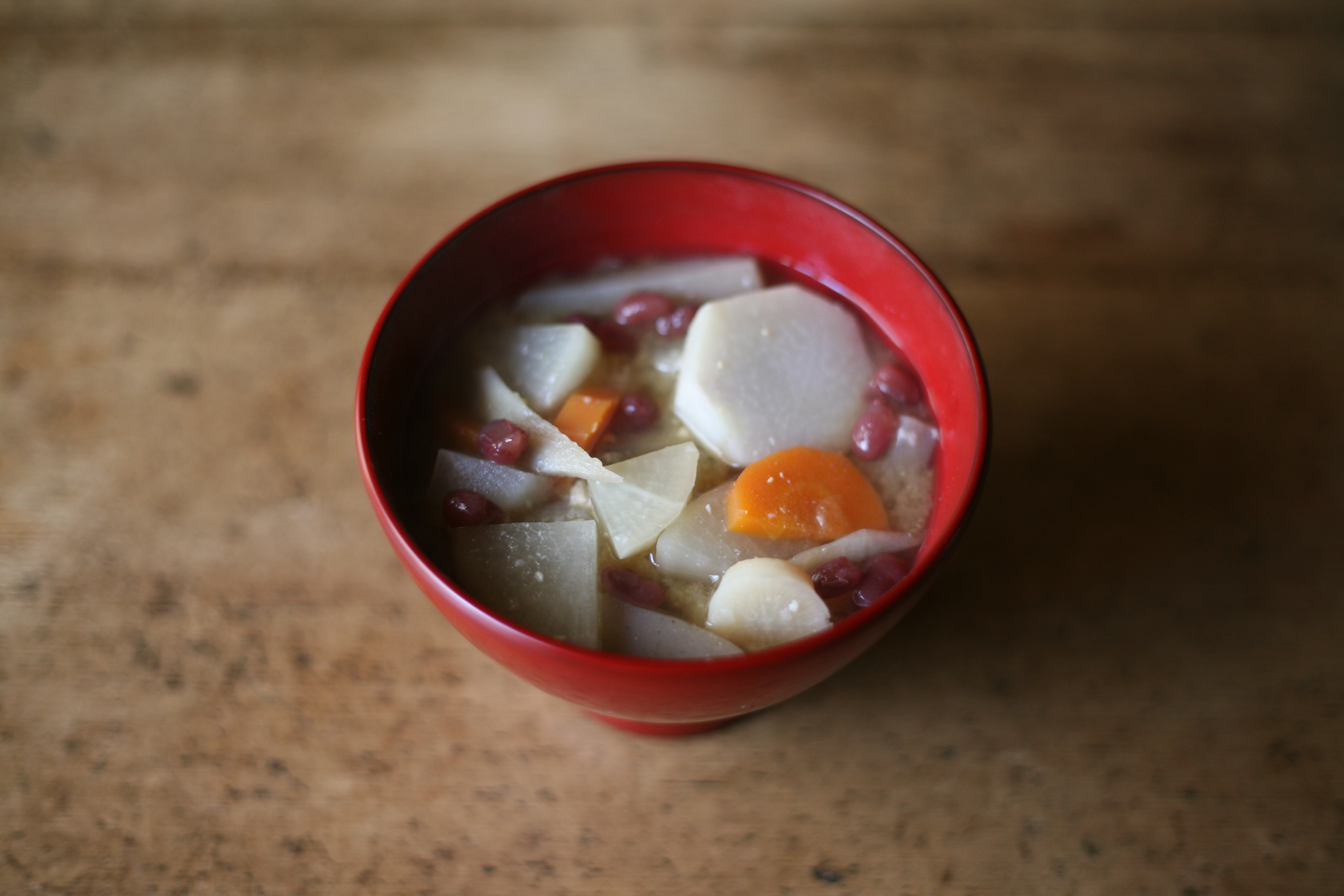 この日には、魔除けや無病息災を祈り、小豆を使った味噌汁「お事汁(おことじる)」を食べる風習があります。お事汁は、旬の野菜や豆類をふんだんに使い、家族で分かち合う特別な料理です。神様に供えるとともに、家族や地域の人々で分かち合い、その年の感謝と来年の豊穣を祈願します。里いも、大根、にんじん、ごぼう、小豆、こんにゃくなど6種類の具材を入れるため、「六質汁(むしつじる)」とも呼ばれます。小豆が魔除けとして、必ず使われるのも興味深い点です。