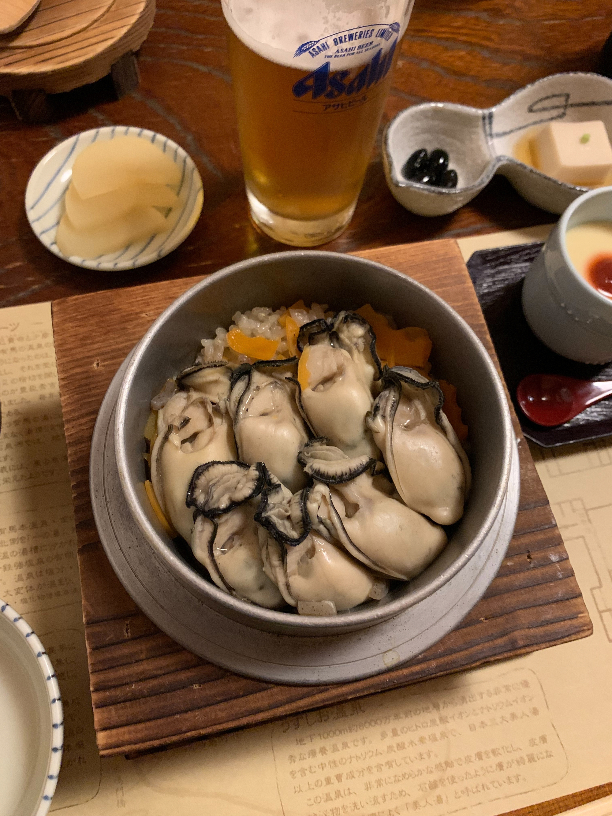 銀の湯は無臭で無色透明、さらさらとやわらかな肌触りの泉質で、心地いいお湯でした。ラジウム泉が気になっていたため銀の湯にしましたが、金の湯や、ほかの日帰り入浴ができる温泉旅館と湯めぐりを楽しむのも良いですね。夜ご飯は、「くつろぎ家」で釜飯を。淡路島近海や瀬戸内で水揚げされた魚介類や山の幸を使った釜飯専門店で、ふっくらとした牡蠣や穴子、鮭がのった釜飯はたまらないおいしさ。いいお湯に入り、その土地のおいしいものを食べ、今年も一年がんばろう、という気持ちにさせてもらいました。