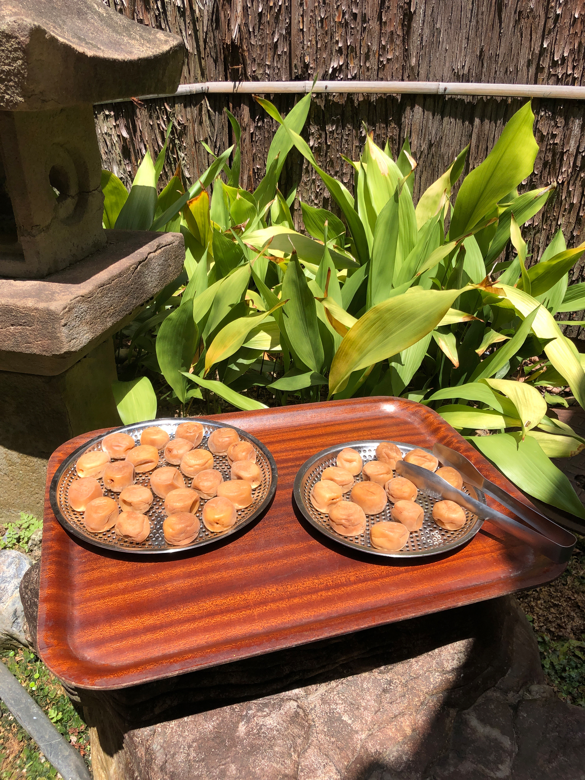 土用干し2日目の今日も、conteのまかない丸バットにまかない平ザルを重ねて、庭先に梅干しを並べています。3日間ほど強い日差しに当てることで、梅は殺菌されて保存性が高まり、皮もやわらかくなるのだそう。