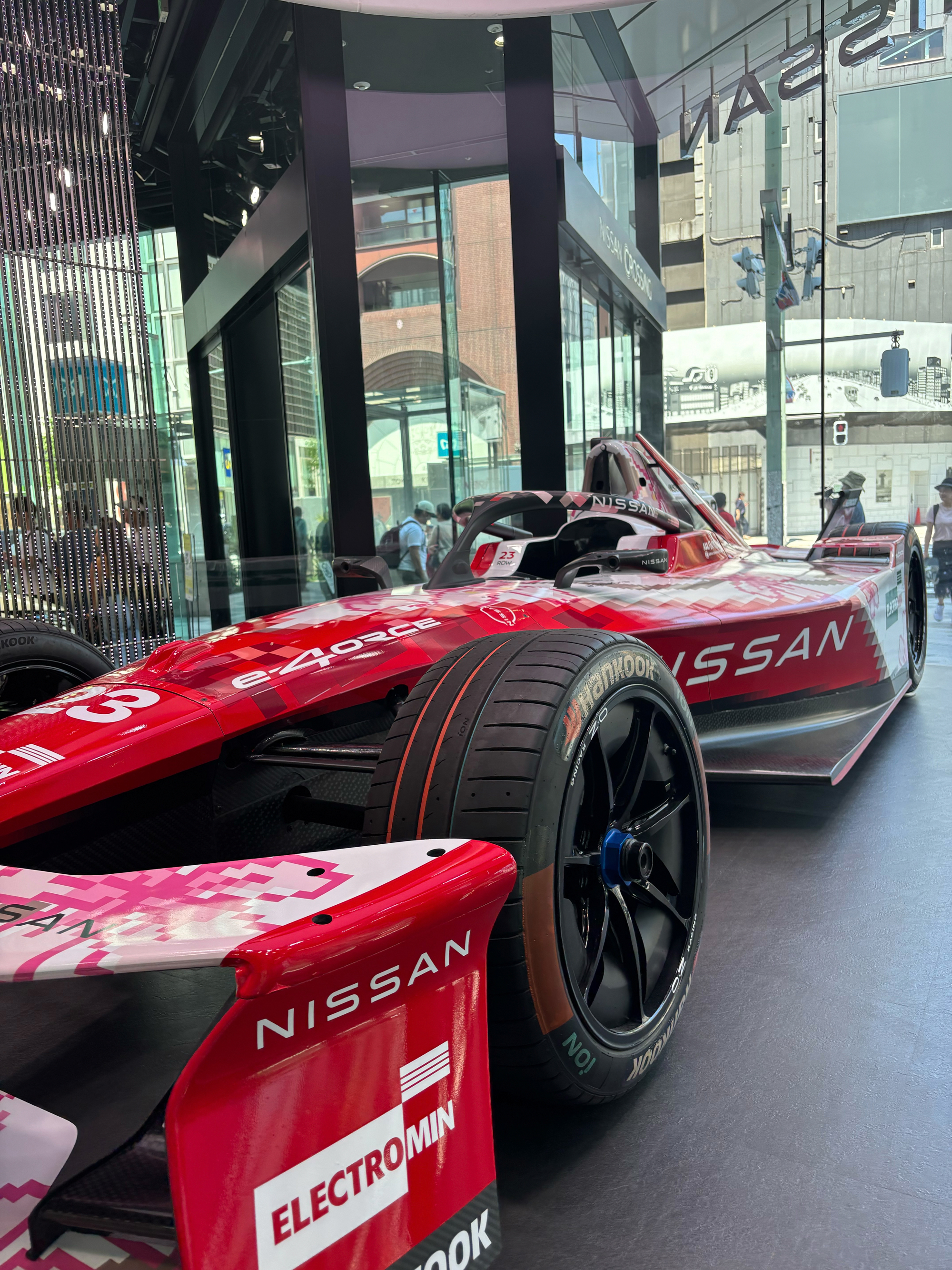 実際に建物の前を通り過ぎると、目に飛び込んでくるのはウィンドウに展示された迫力満点のスポーツカーです。建物の1、2階は、日産自動車が運営するブランド発信拠点“NISSAN CROSSING”と名付けられたショールームで、未来のドライビング体験を提供しています。世界でも高い評価を受けている日本のものづくりを代表する“日本車”のショールームとあって、昨今のインバウンドにより国際色豊かなにぎわいを見せています。この贅沢な立地の交差点に、日本車を展示する意義を改めて感じることのできる空間です。