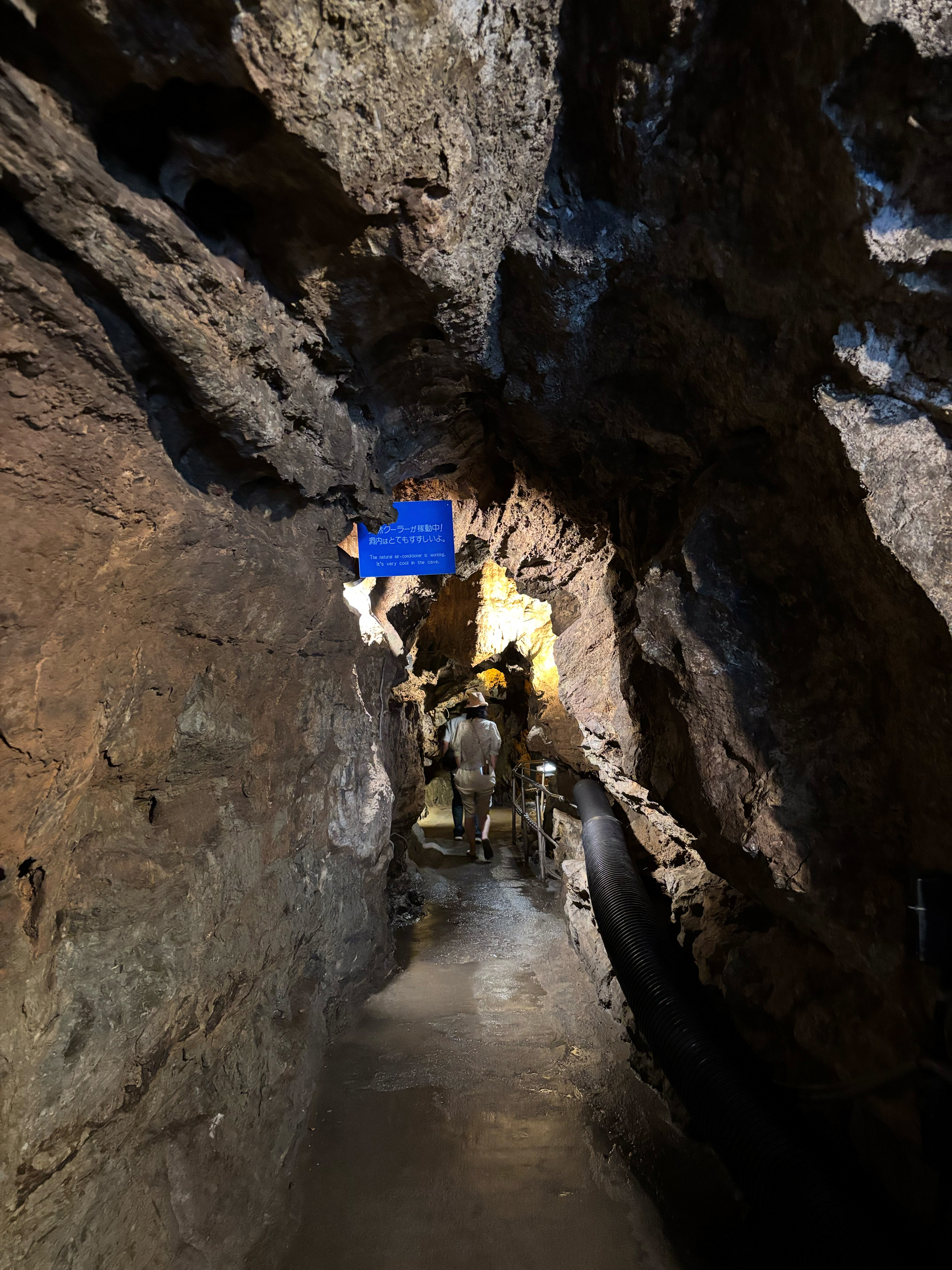 標高359mの竜ヶ石山の南麓に開口され、2億5千万年前の地層といわれる秩父古生層の石灰岩地帯にあります。洞内は年間を通して約18度と、真夏にはひんやりとても心地よい天然クーラーの空間が広がっていました。総延長1,046mのうち一般公開されている400mは、人とすれ違うのも難しいような細いコースを洞窟探検するように進みます。