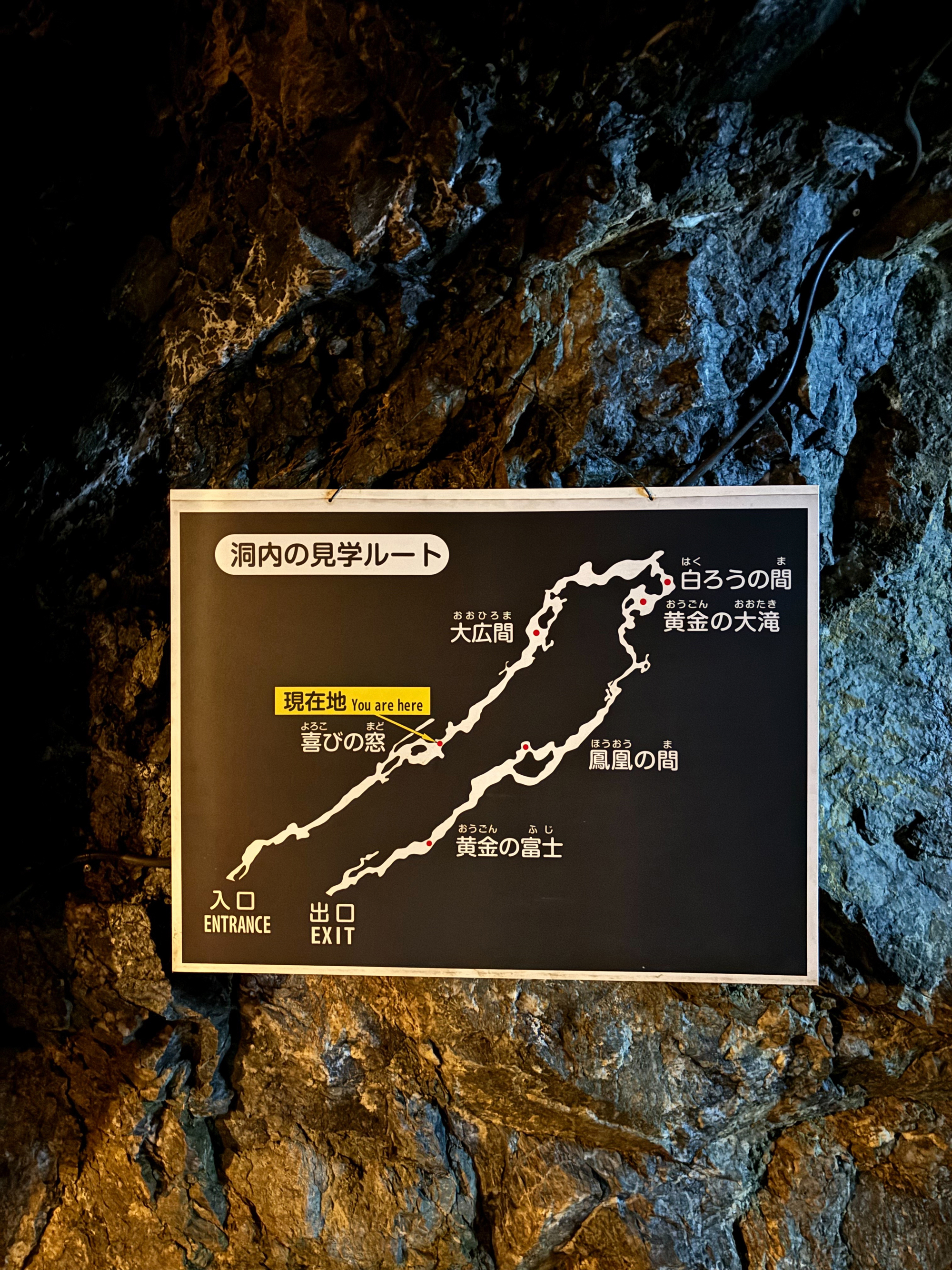 コースはU字の一本道です。道中には代表的な鍾乳石の紹介や、コウモリをはじめとするここに住む生物の紹介、滝の落ちる場面もあり厳しい外の暑さを忘れて楽しむことができました。コースを歩き終えたゴールには資料館が設けられ、夏の自由研究の題材のために子どもたちでにぎわっています。
