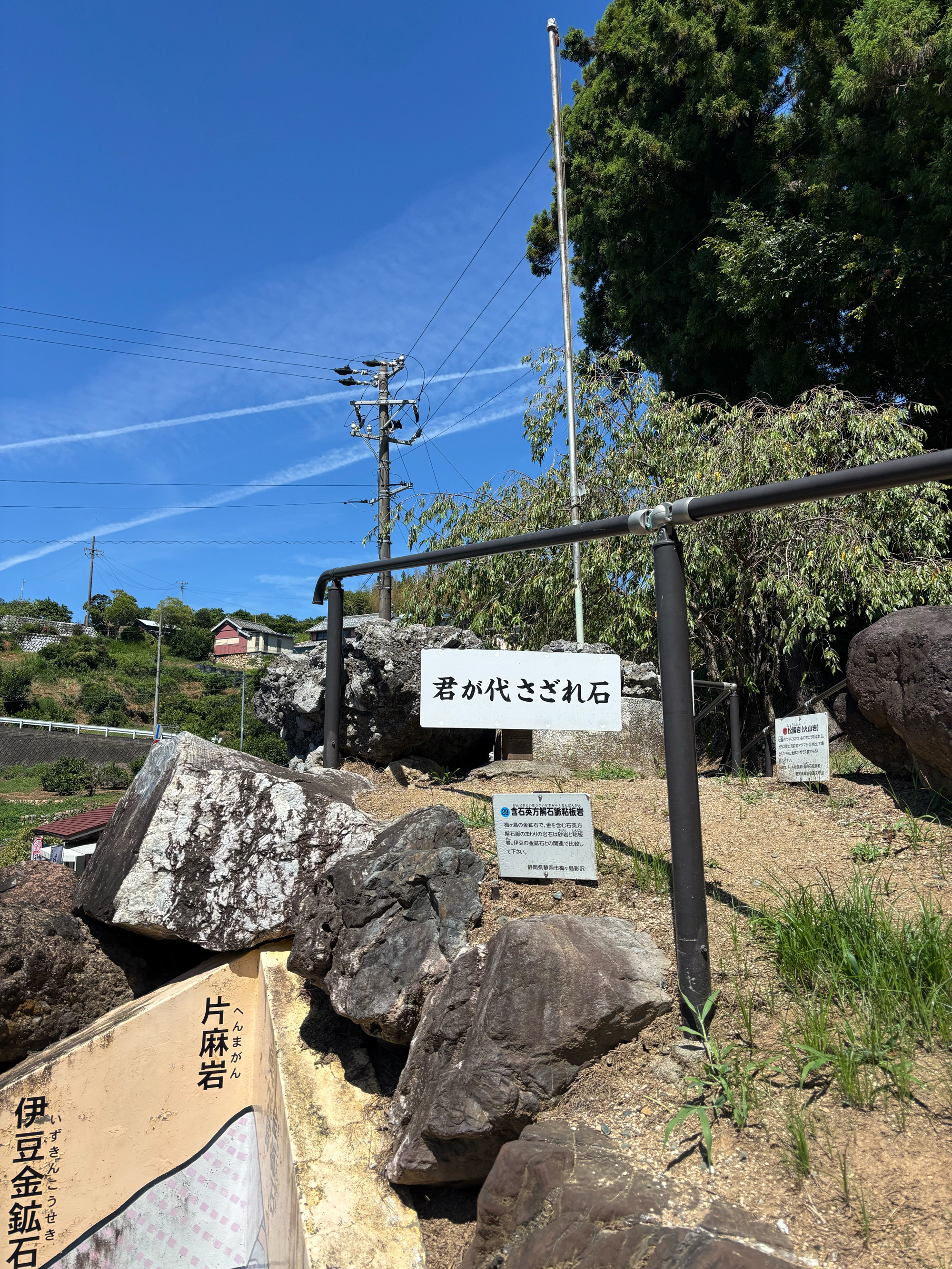 涼しい洞内から真夏の屋外へ戻った帰り際に、敷地内に設けられた岩石園の天辺に目を向けるとなんだかなじみ深い文字が目に留まりました。君が代“さざれ石”です。