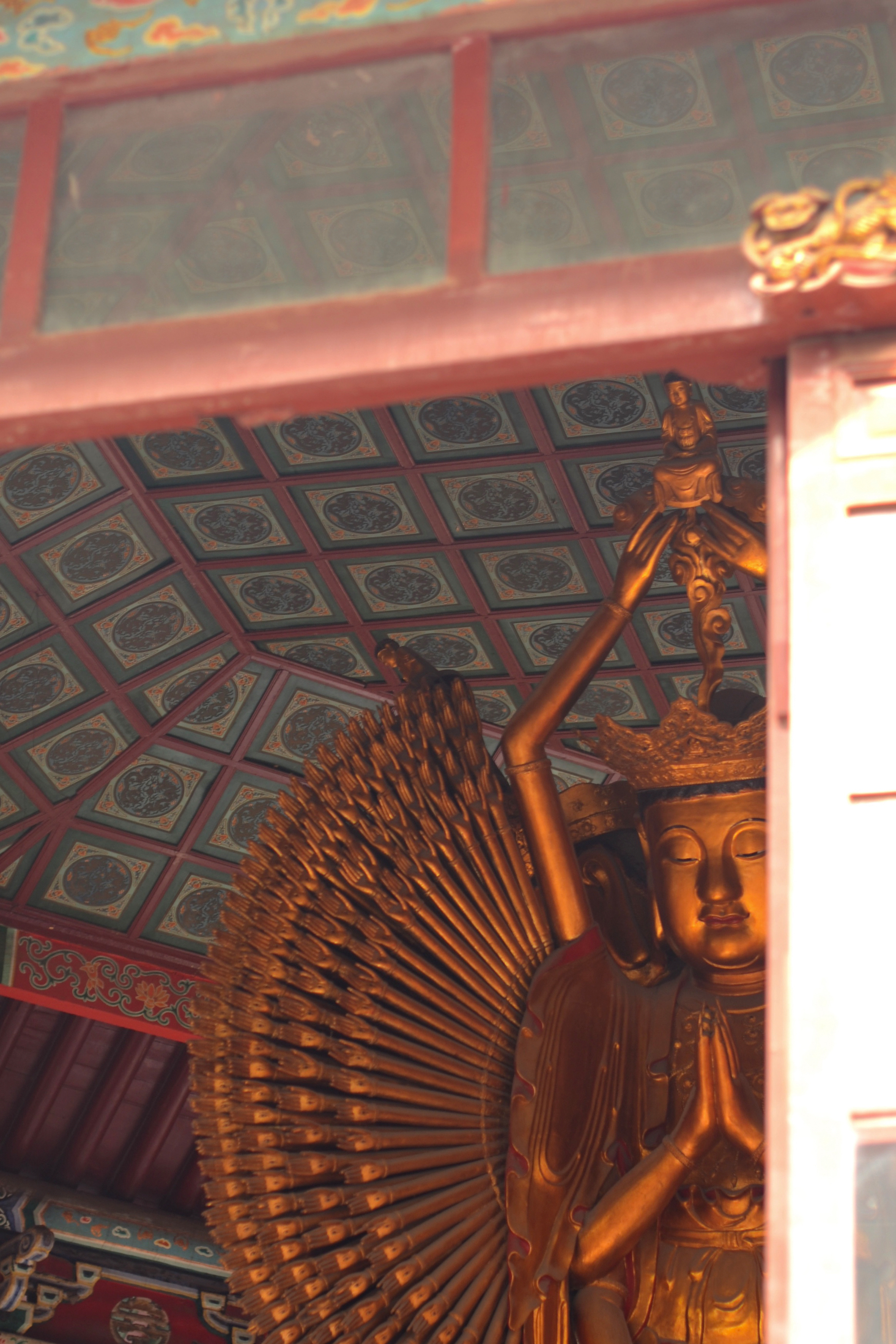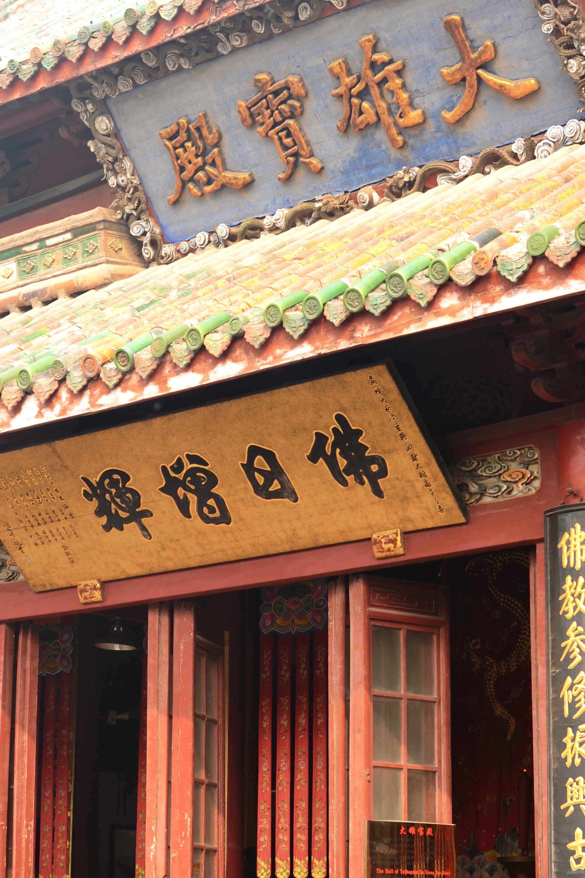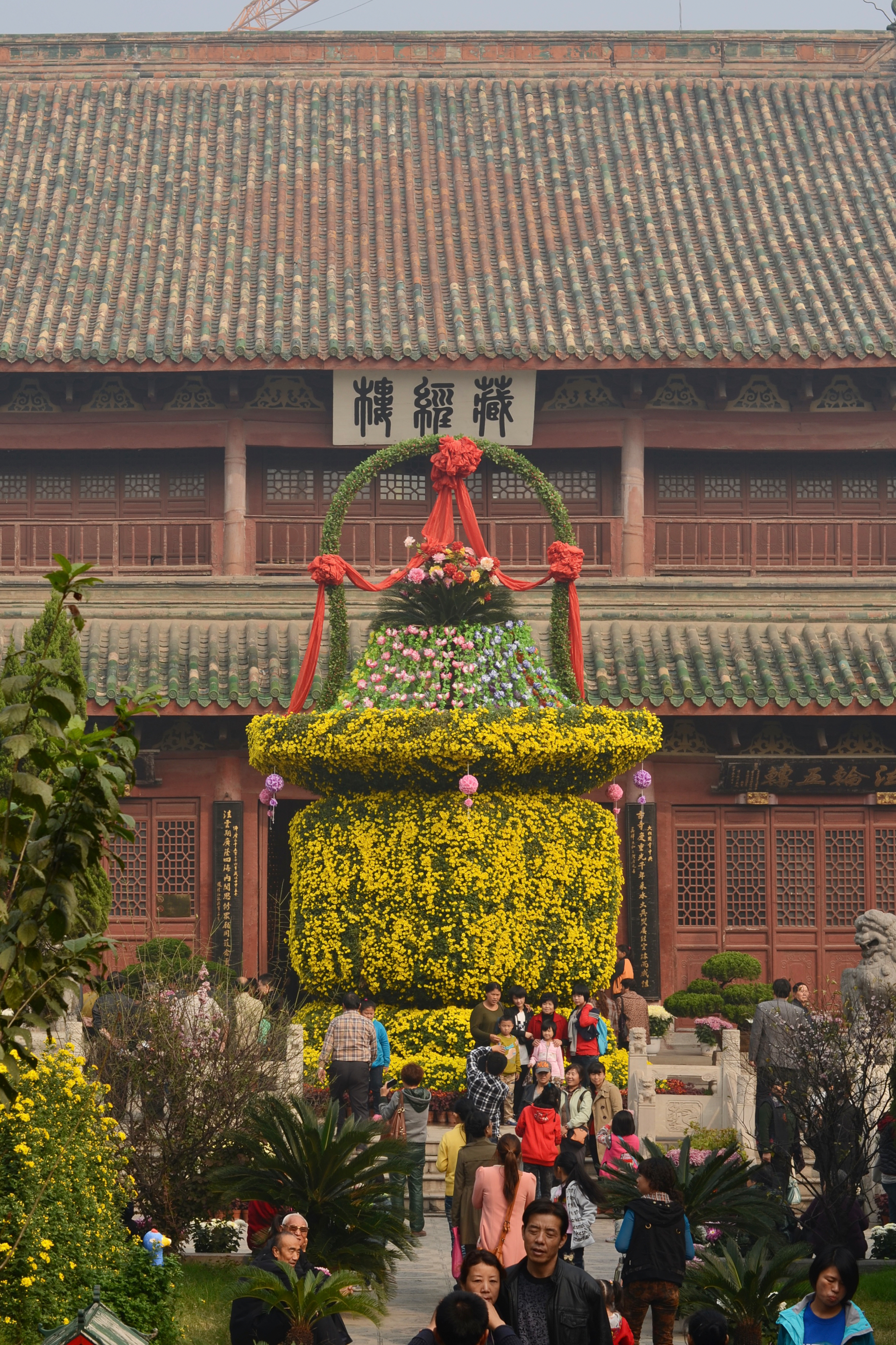 現在の大相国寺は、明清時代の建築様式を伝えるもので、大門、天王殿、大雄宝殿、八角瑠璃殿、蔵経楼等から成ります。主殿の大雄宝殿は、清代の順治帝の時代に再建されたもので、内部には、高さ4.3mの釈迦牟尼像が安置されています。また、八角瑠璃殿の内部には、高さ7mの四面千手千眼観音像が安置されています。私が開封の大相国寺を訪れたのは10月で、ちょうど開封の街全体で菊祭が開催されており、大相国寺の境内にも、丁寧に手入れされた菊が所狭しと飾られ、寺院建築に落ち着いた華やぎを添えながら、多くの参拝客の目を楽しませていました。そしてその境内には、京都の相国寺の境内に立っているものと同じ「友好記念碑」が静かに立っていました。日本との縁はそれだけではなく、遣唐使として中国に渡った空海が一時期、大相国寺に滞在したといわれており、それを記念して、境内の大師堂に、空海の銅像も建てられています。