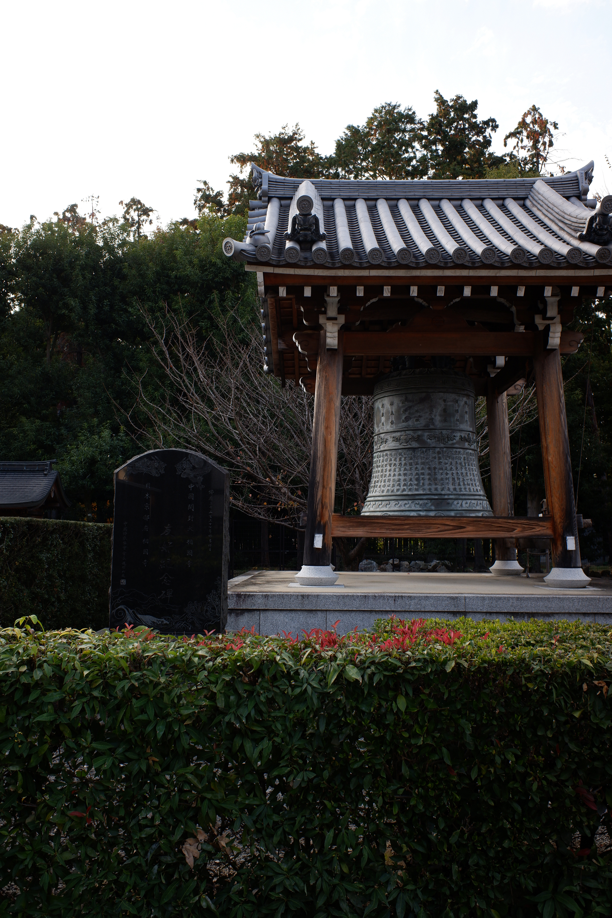 相国寺境内には、十二の塔頭寺院がありますが、京都を訪れる観光客にもよく名の知れた金閣寺・銀閣寺も共に、相国寺の山外塔頭寺院であることは、意外に知られていないのではないでしょうか。金閣寺が足利義満によって創建されたことは広く知られていると思いますが、実は相国寺とほぼ時を同じくして創建されたのです。銀閣寺のほうはその後年、室町幕府八代将軍である足利義政により創建されています。いずれも、足利歴代将軍が創建した禅宗寺院として、本山である相国寺の塔頭寺院となり今に至っています。さらに、法堂正面に向かって左脇の「天響楼」と呼ばれる鐘楼があり、そこに「友好記念碑」も立っており、そのそばの看板に以下のように書かれていることも、あまり知られていないかもしれません。