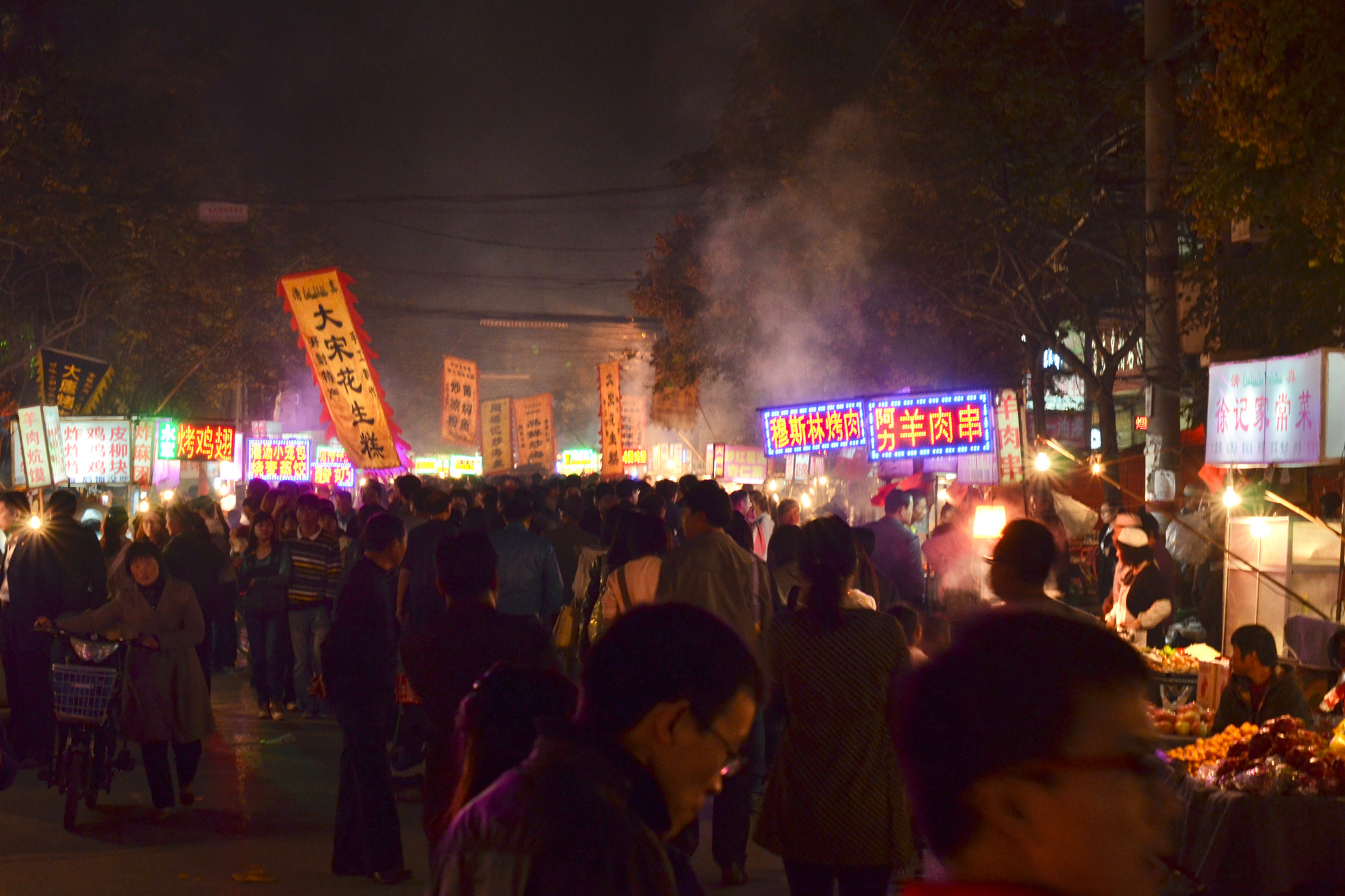 現在の開封の街は、北宋時代の栄華はあまり感じられませんが、それでも、当時から続く街の活気を味わえる場所があります。それは夜市です。北宋より前の時代には、商売は官営で、同業組合によって厳しく管理されていたところ、北宋の時代には、商売の自由化が進み、その結果、夜市も盛んに開かれるようになりました。現在の夜市はその歴史を引き継ぐもので、それはそれはにぎやか。決して観光客向けに作られたものではなく、地元の人たちもたくさんいて、評判のよい屋台には長い行列ができていました。その熱気に包まれるだけでも、旅気分が盛り上がります。中国のほかの都市でここまで夜市が発達しているところはなかなかないので、大いに楽しみました。