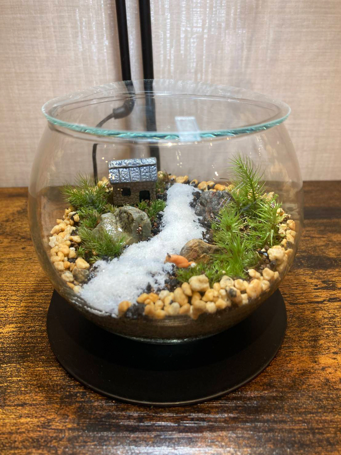 以前、私は友人が働いていることをきっかけに、苔テラリウムのワークショップに参加しました。苔テラリウムはガラス内にどの苔をどのように配置するのか、どのような景観を造るのかを自分で考えながら制作します。店舗内の苔テラリウムでは、滝を表現していたり、登山をしている人がいたり、牧場風景を造っていたりとさまざまなものが展示されていました。