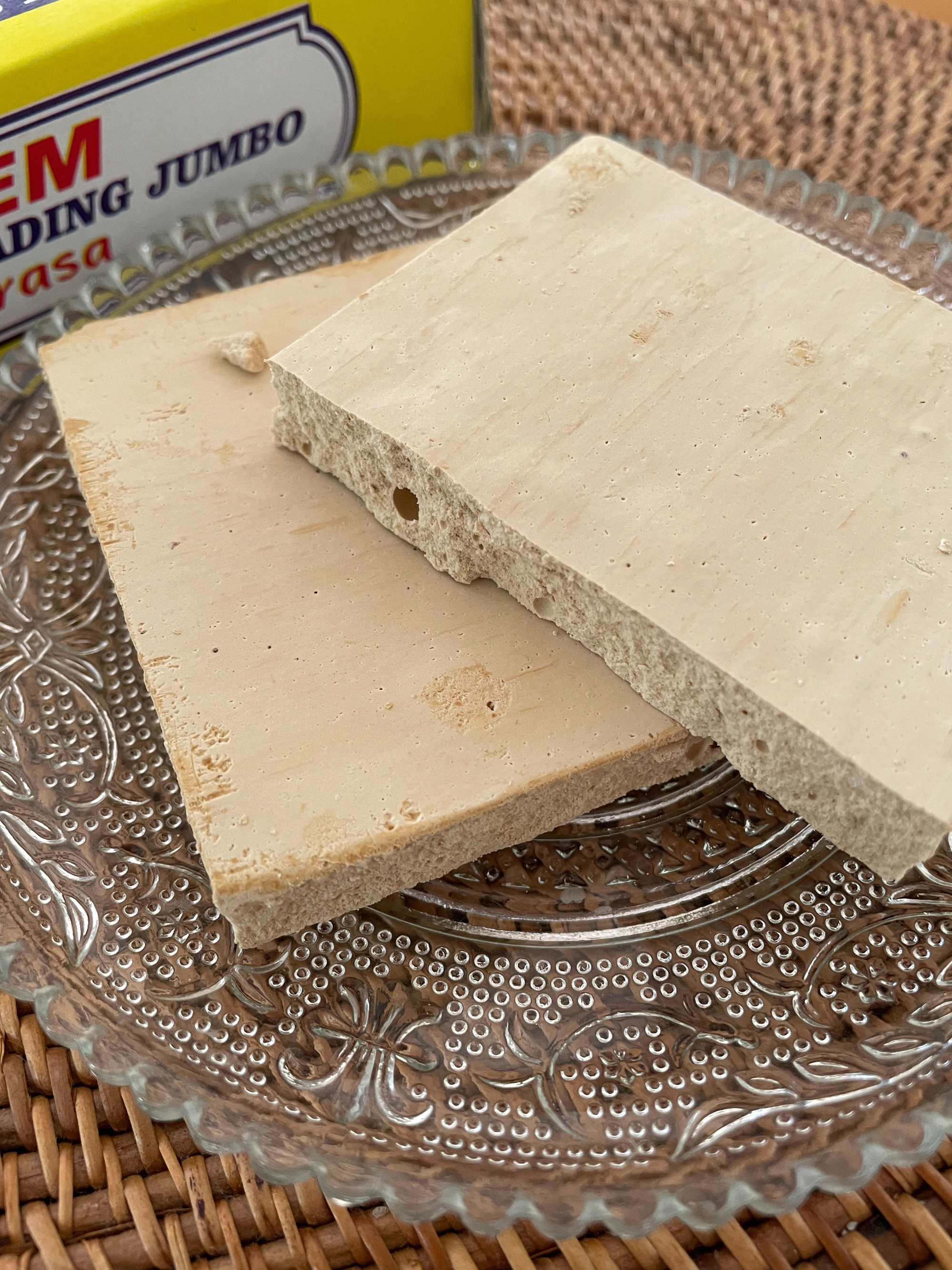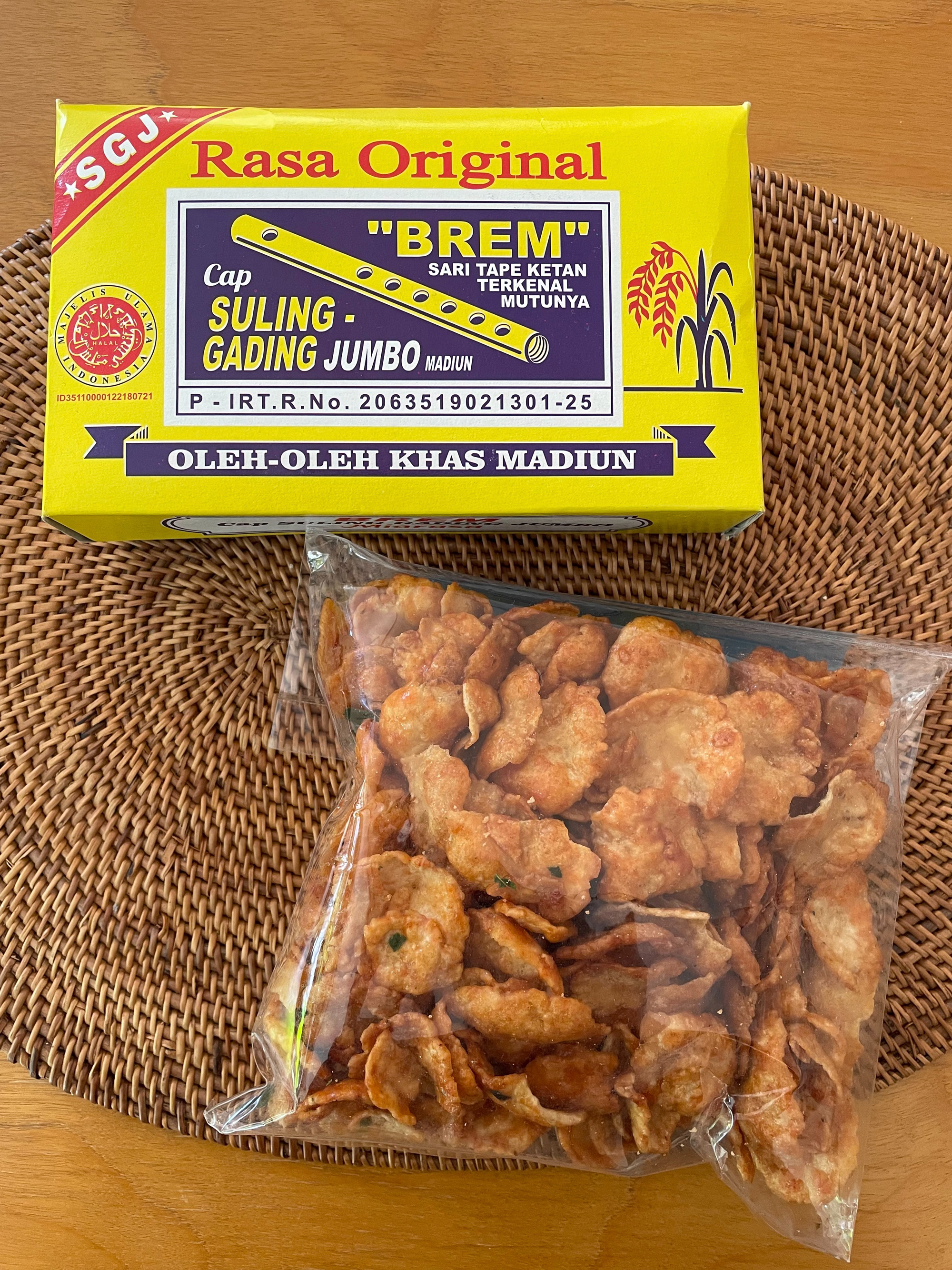 そんな食文化のインドネシアで昔から食べられている、ちょっと興味深いお菓子をご紹介します。まずは“ブレム”です。こちらはもち米を発酵させたときに出る絞り汁を乾燥させて作られたものです。出来上がりは、白色や薄黄色の薄い円板や板状の固体で、ポリポリと割りながら口に入れるとサッと溶ける不思議な食感。ほのかな甘み・酸味・少々のアルコールの香りが特徴です。見た目は日本の落雁のようですが、そこまで甘味が強いわけでもありません。まるでラムネのようにシューッと溶けるような、なんとも不思議な気持ちになるお菓子です。いつも口に含んだあと、「これはなんだろ〜」と遠くを見つめてしまいます。パッケージも素朴なイラストで蓋を開けるとザックリと密封もされていないブレムが入っています。それがまたとてもとてもいい感じなのです。炭水化物(糖分)が高いため食べ過ぎには注意ですが、発酵食であることやカルシウムや鉄分も含まれるということで気になる存在です。