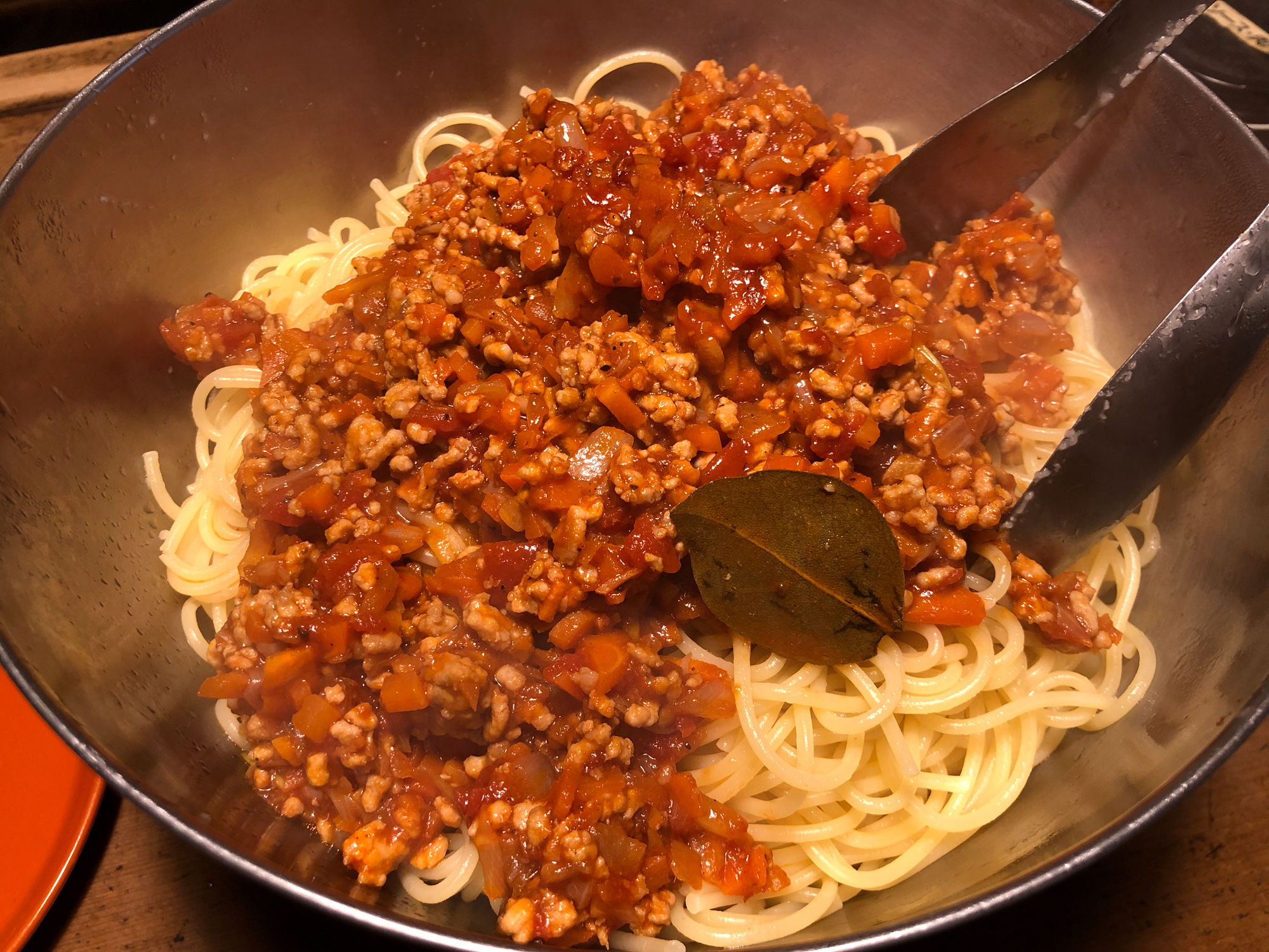 まずにんにくをみじん切りにして、多めのオリーブオイルで香りが出るまで弱火で熱します。みじん切りにした玉ねぎと人参を加え、しんなりするまで中火で加熱、豚ひき肉(150g程度)を入れたら、塩と黒胡椒を振って色が変わるまで炒めます。一度火を切り、ホールトマト1/2缶、コンソメ少々、ウスターソース大さじ1、トマトケチャップ大さじ2を入れ、ローリエ1枚とナツメグ少々を加えて再度加熱し、ソースがフツフツとしてきたら、弱火で約15分。水っぽくなくなるまで煮詰め、最後に塩や追加のケチャップで味を調えたら出来上がり。今回はこのミートソースを使って、ミートソース・スパゲッティを作ります。