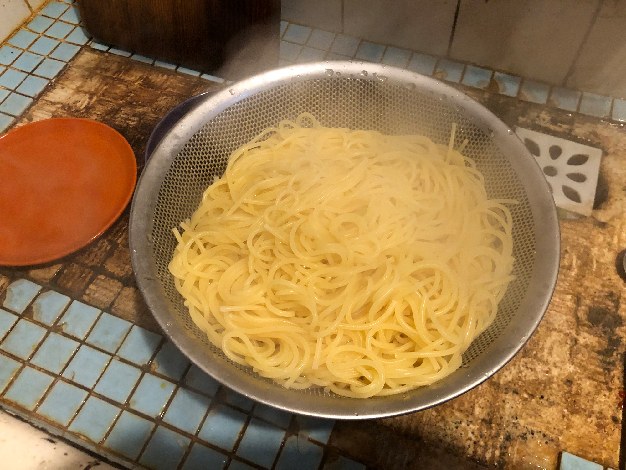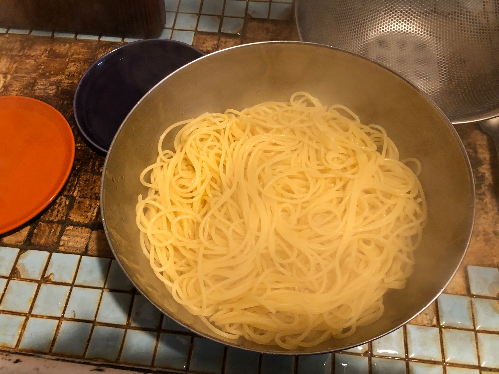 時間を合わせて茹でておいたパスタのお湯を切りボウルに入れ、オリーブオイルを回しかけて和えてからミートソースをかけます。我が家では二人ともたくさん食べることが大好きなので、この「柳宗理のステンレスボール23cm」にパスタを山盛りにし、トングで取り分けて食べるというスタイルが定着しました。パスタの茹で汁を切る際、パンチングストレーナーの下にボウルをセットすれば、熱い茹で汁でボウルを温められて一石二鳥です。お湯を捨ててパスタを盛り付け、ボウルごと食卓へ持っていきます。ステンレスボール23cmには本間数勇商店のわら鍋敷き小を下に敷くと、ちょうどフィットしてぐらつかないので、ぜひセットでお試しください。