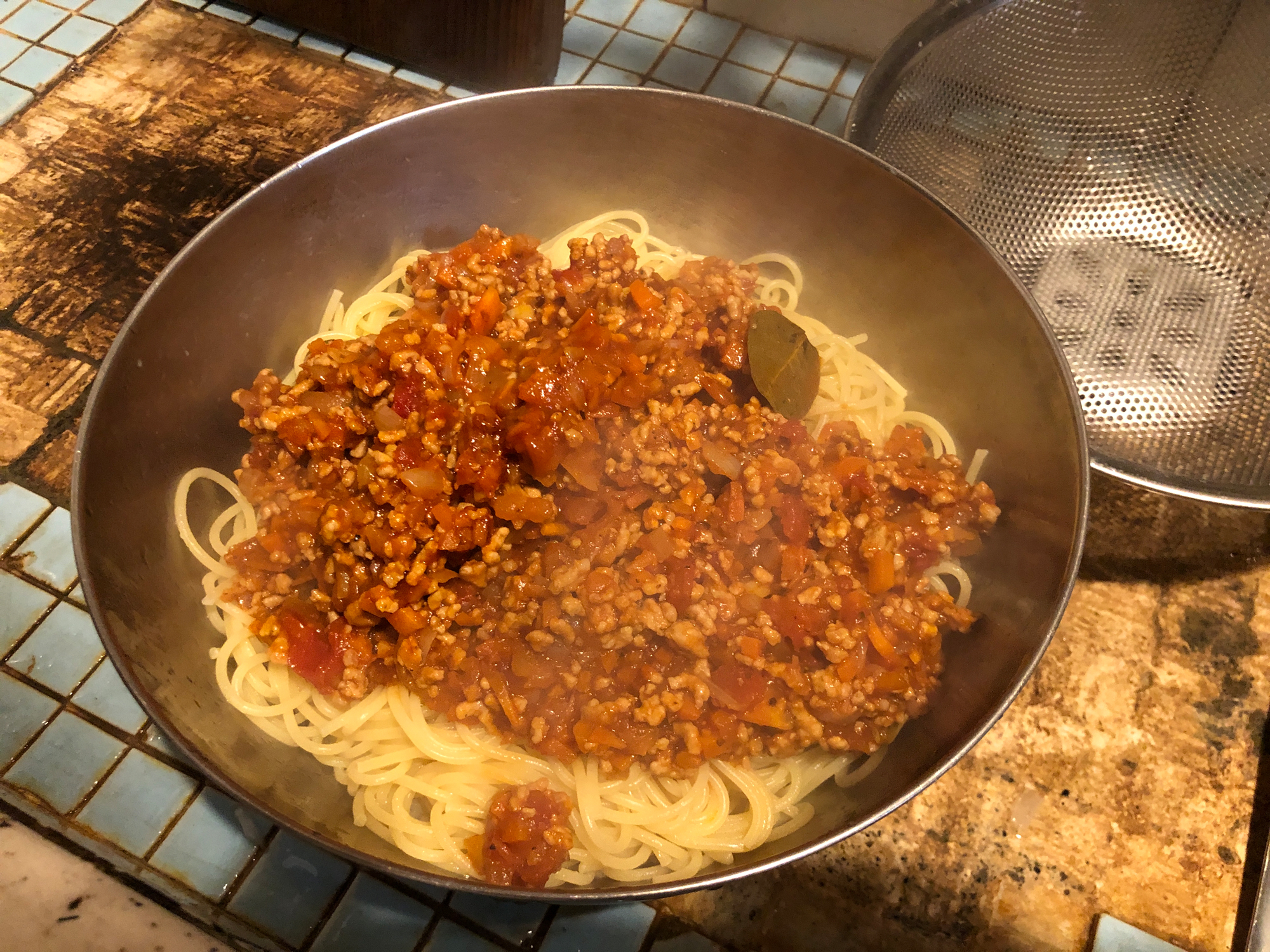 今日はちょうど、少し前にカレーに使ったホールトマトが半分余っていたこと、昨日作った餃子用の豚ひき肉の残りがあったこと、使い切りたい玉ねぎが1個、人参がちょっとだけ、という冷蔵庫の中でビンゴが揃ったような状況だったので、久々に「思い出のミートソース」を作ってみることに。
