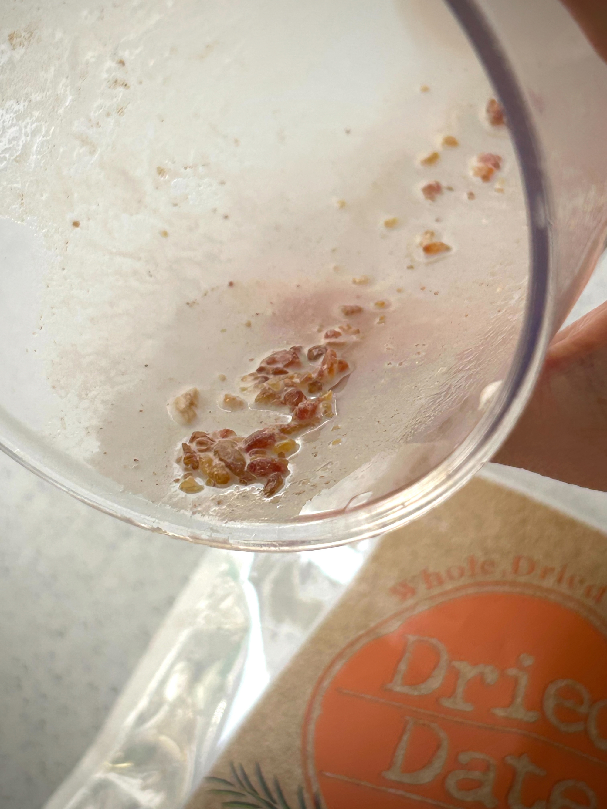 何のレシピも見ずに、バナナミルクを作る要領で、デーツ3粒と牛乳コップ1杯分を合わせ、ブレンダーでガーっと回してみたところ、デーツが思いのほか固く、牛乳が少し飛び散って慌てましたが、なんとか撹拌することができました。氷の入ったグラスに注ぎ、完成!いざ飲んでみると、甘ったるさはなく、思った以上においしかったのですが、もっとおいしくできるのではないか!?という気持ちが湧き上がり、今度はいろいろなレシピを検索してみました。