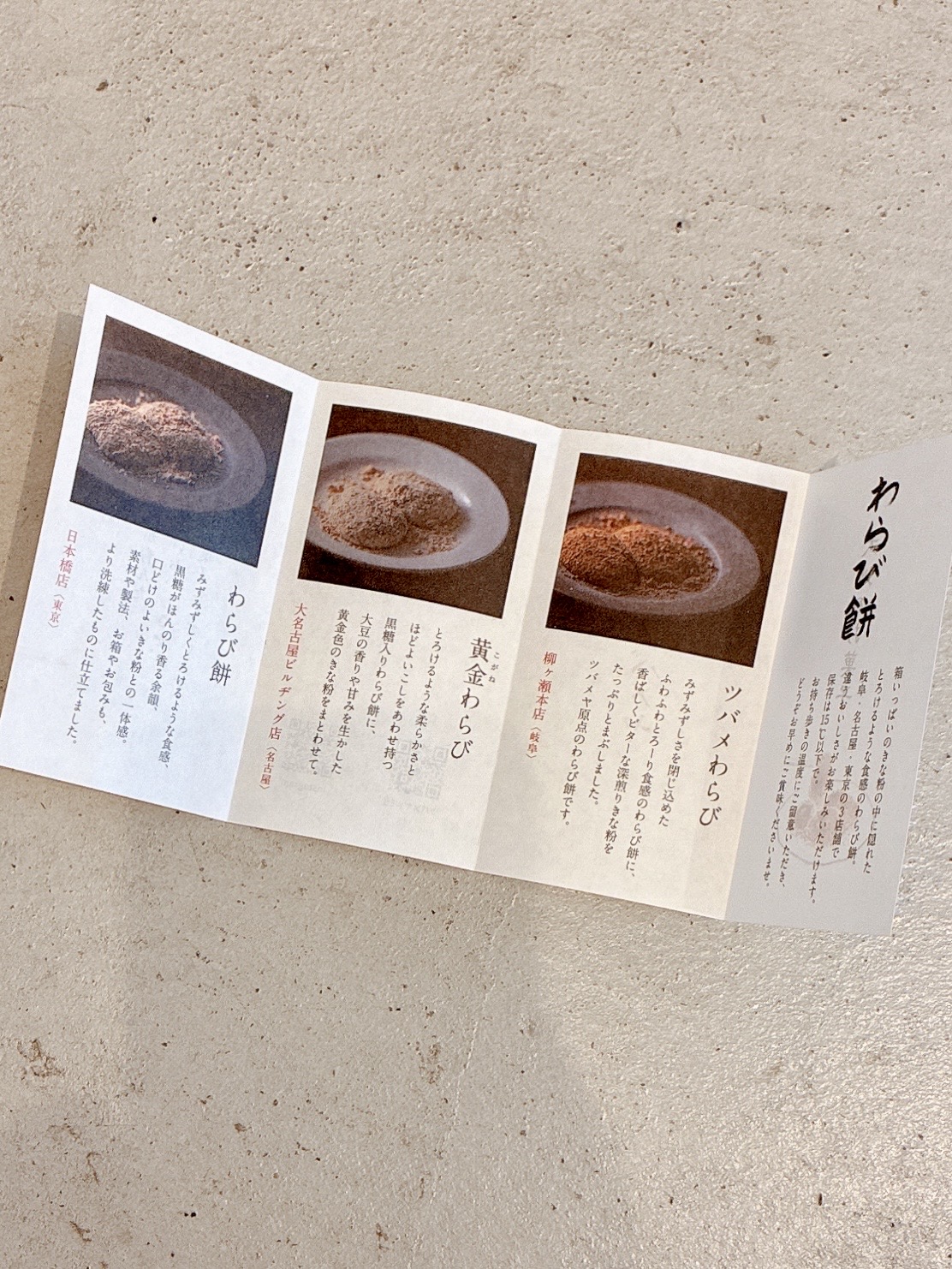 看板商品のわらび餅は、店舗ごとに違うおいしさを楽しむことができるというニクイ演出。東京日本橋のわらび餅は、ほんのりと黒糖が香るみずみずしいわらび餅に、口溶けの良いきなこをたっぷりまとわせてあります。