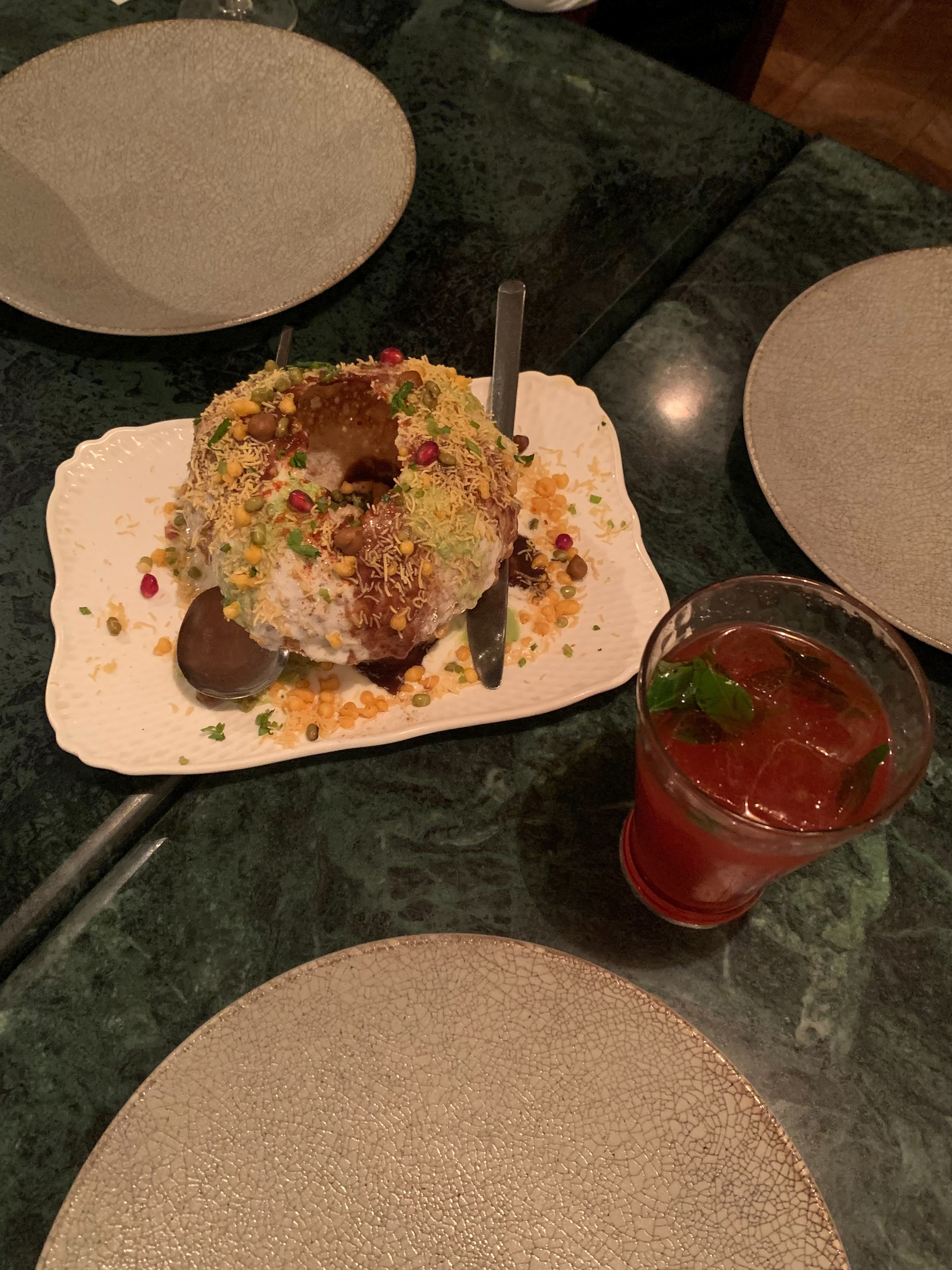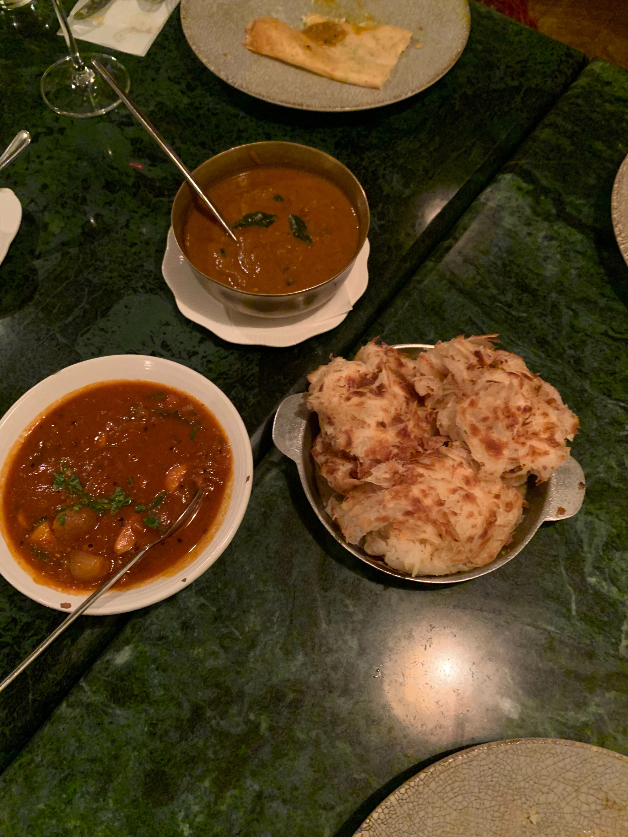 カレーリーフとスパイス香るローズモヒートには、ウォッカを追加。口の中で味と食感のクラッカーが弾けたような「ラジカチョリ」、大きな三角形の「チーズドーサ」、コク深い「マトンビンダルー」は、さくもちふわで新食感な「バンパロタ」にたっぷりつけていただき、最初から最後まで驚きと楽しさに満ちていて、南インド料理をもっと深めたくなった夜でした。南インド各州のレストランでシェフをしていた経験を持つマニカンダンさんによるお料理もさることながら、清水焼や友禅板の廃材などを使用し、高級感がありながらもローカルでオーガニックな店内も魅力です。